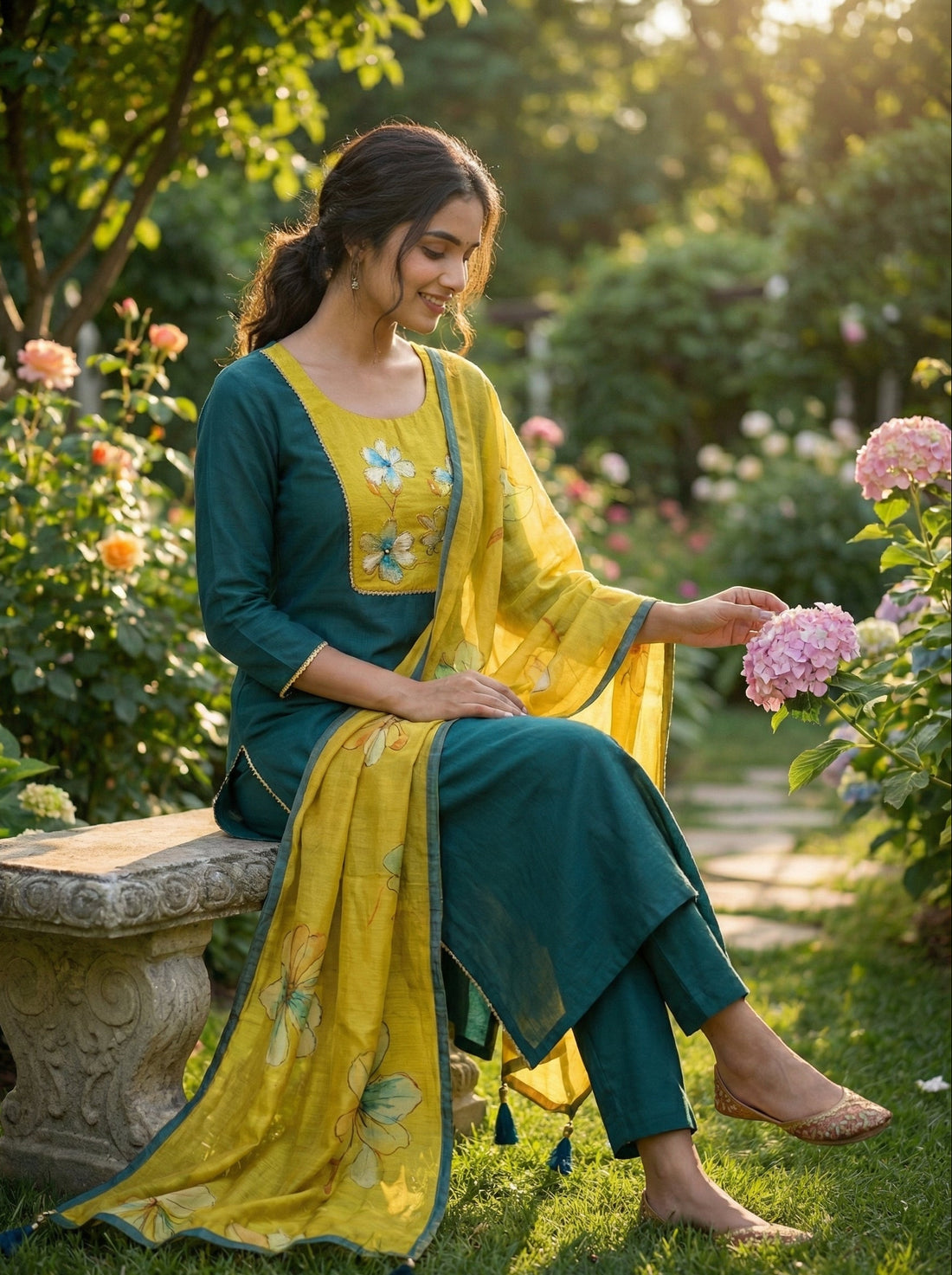 Description:A refreshing dark green kurta set paired with a vibrant mustard-yellow dupatta, designed to bring...