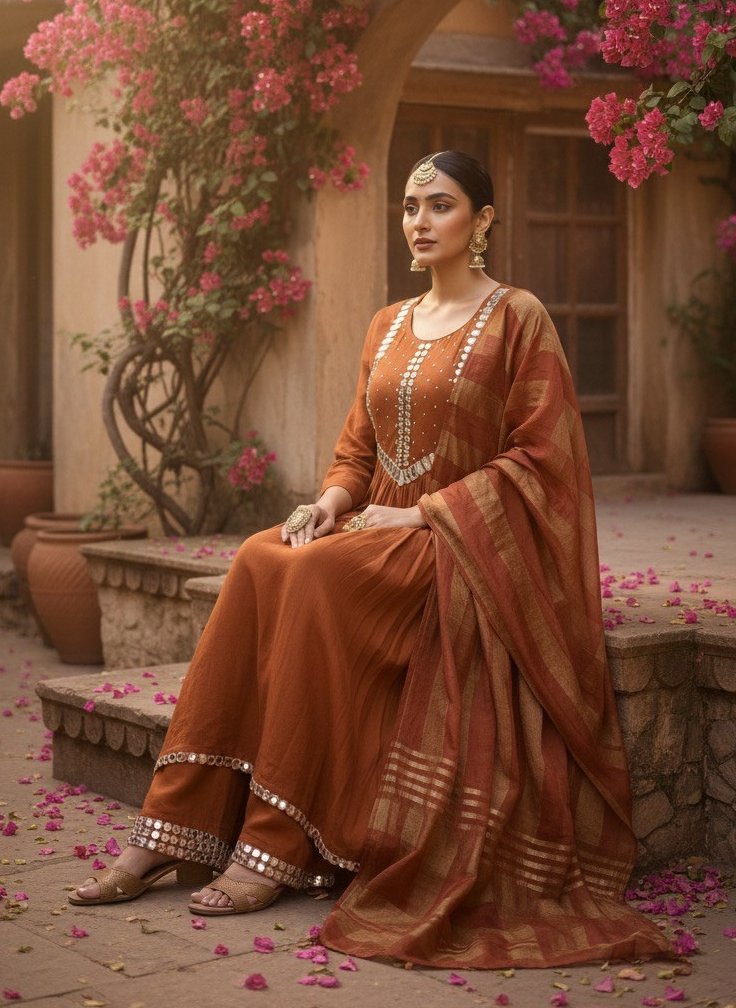 Description:A warm, earthy rust mirror-work kurta set that blends traditional craftsmanship with effortless elegance. The...