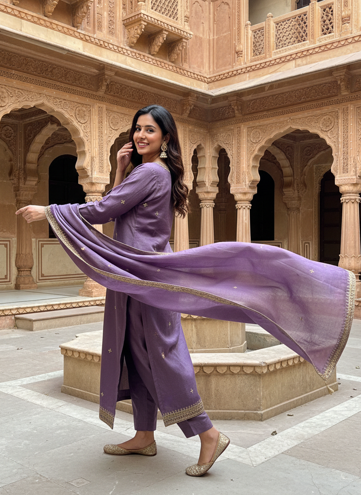 Lavender Hand-Embroidered Kurta & Dupatta Set