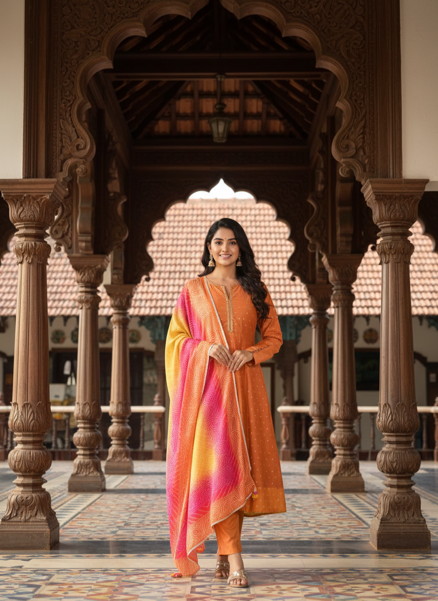Burnt Orange Kurta Set with Vibrant Ombre Dupatta