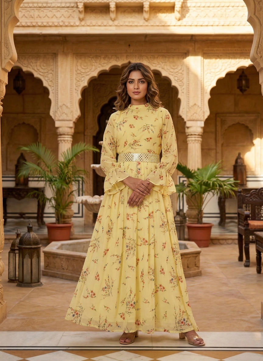 The Butter Yellow Floral Anarkali Dress is a dreamy blend of elegance and soft femininity....