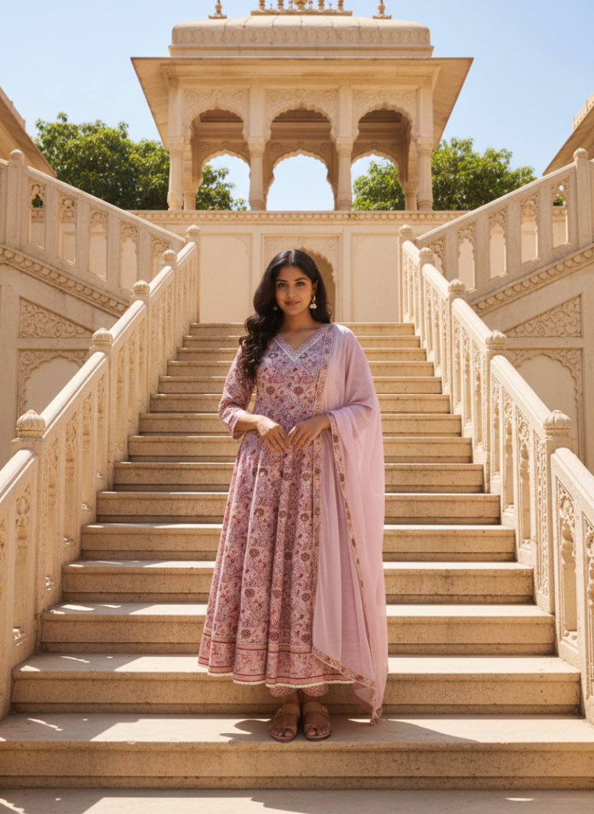 Blossom Pink Floral Anarkali Kurta Set with Dupatta