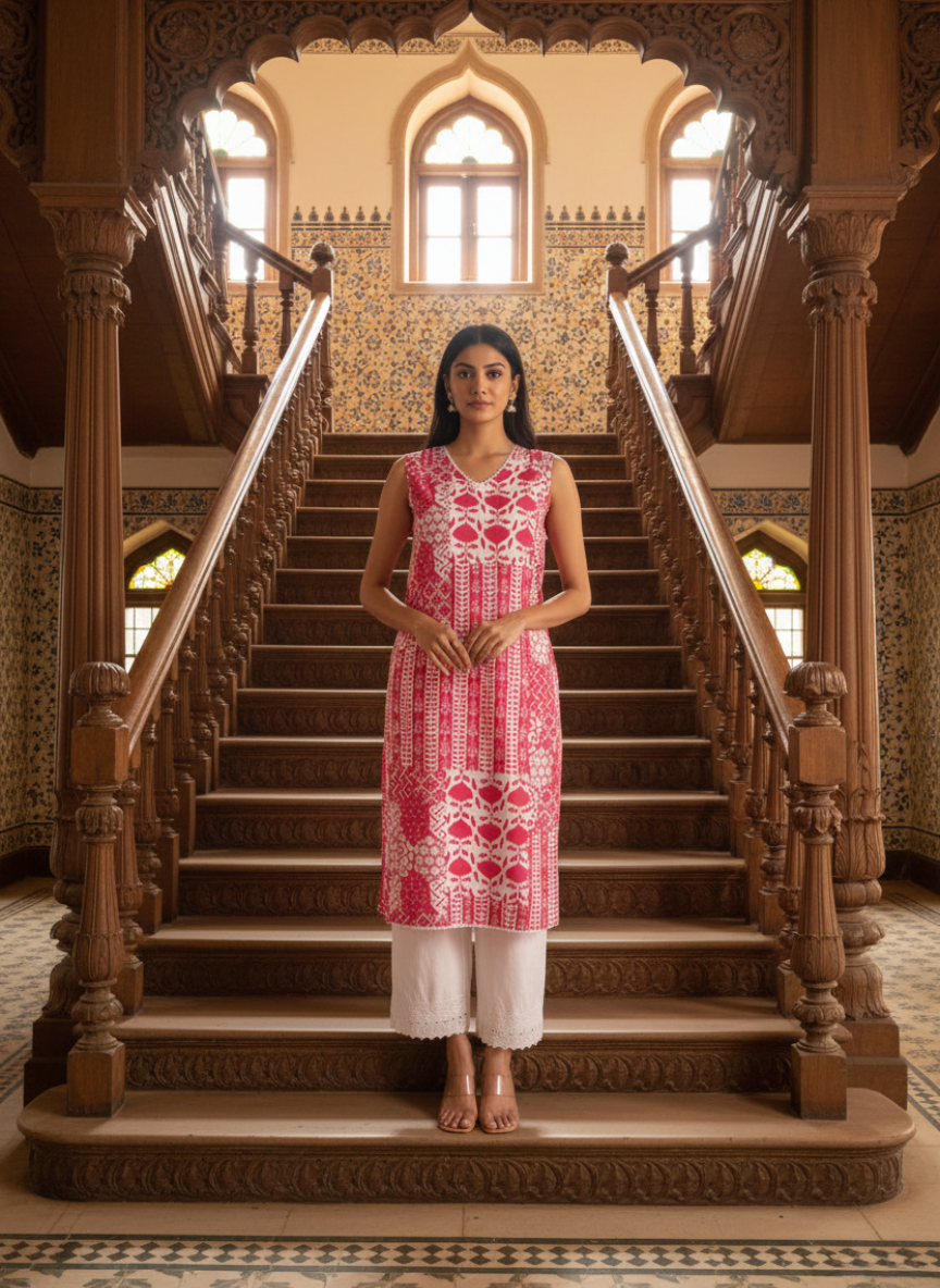 This charming three-piece cotton kurta set in carnation pink features a long A-line kurta adorned...