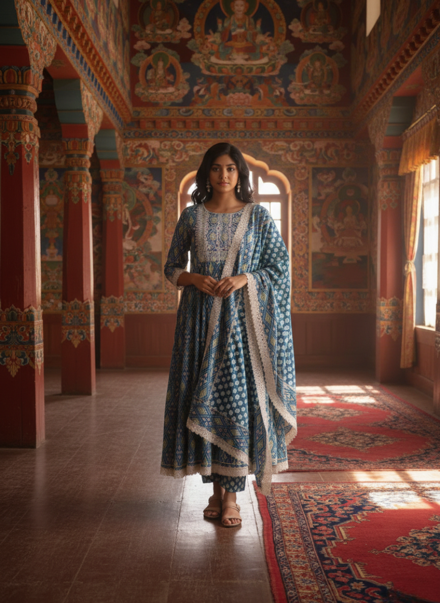 Description:A timeless blend of comfort and tradition, this blue ethnic printed A-line kurta brings effortless...