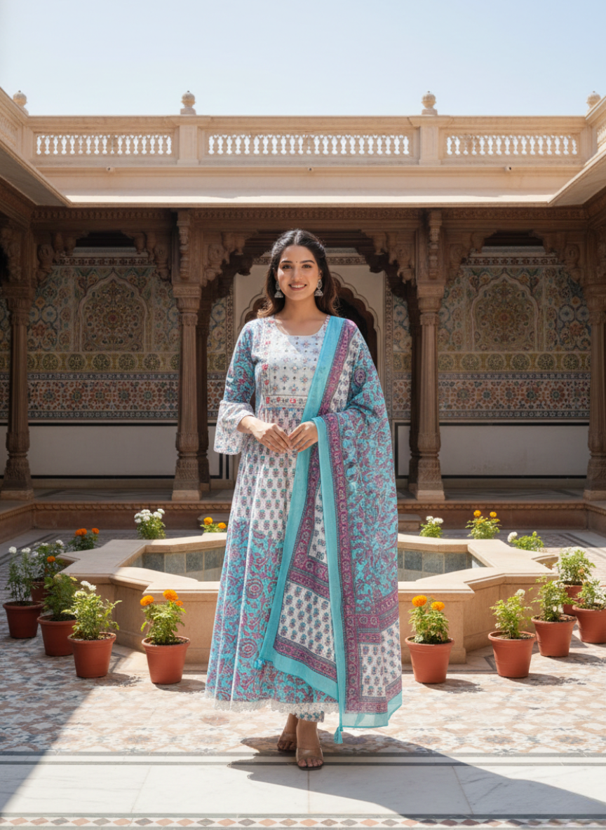 Artistic Floral Pale Teal Anarkali Cotton kurta set
