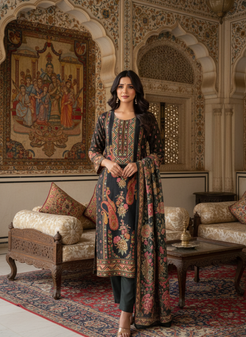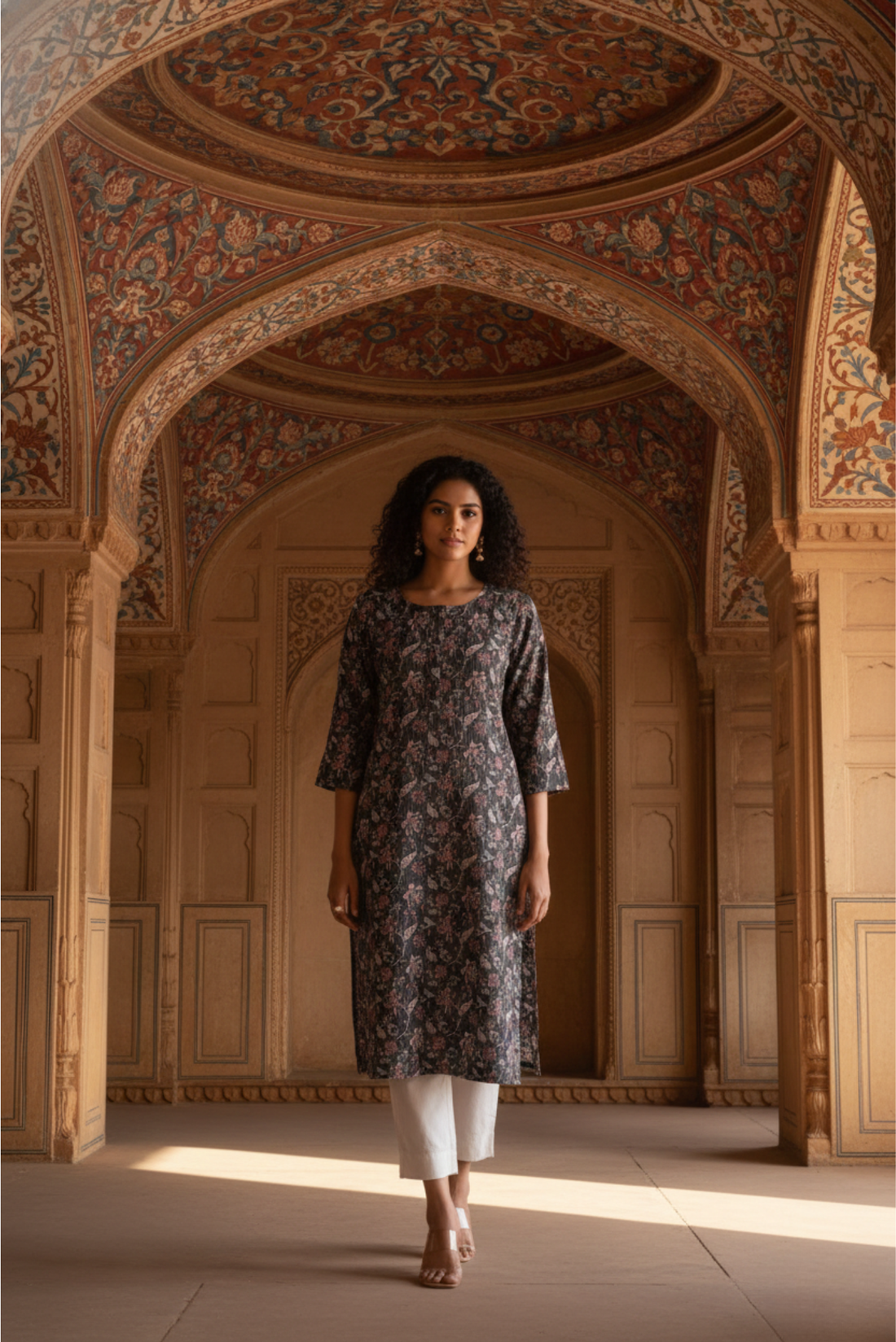 The Charcoal Black Printed Kurta Set is a refined blend of tradition and contemporary elegance....