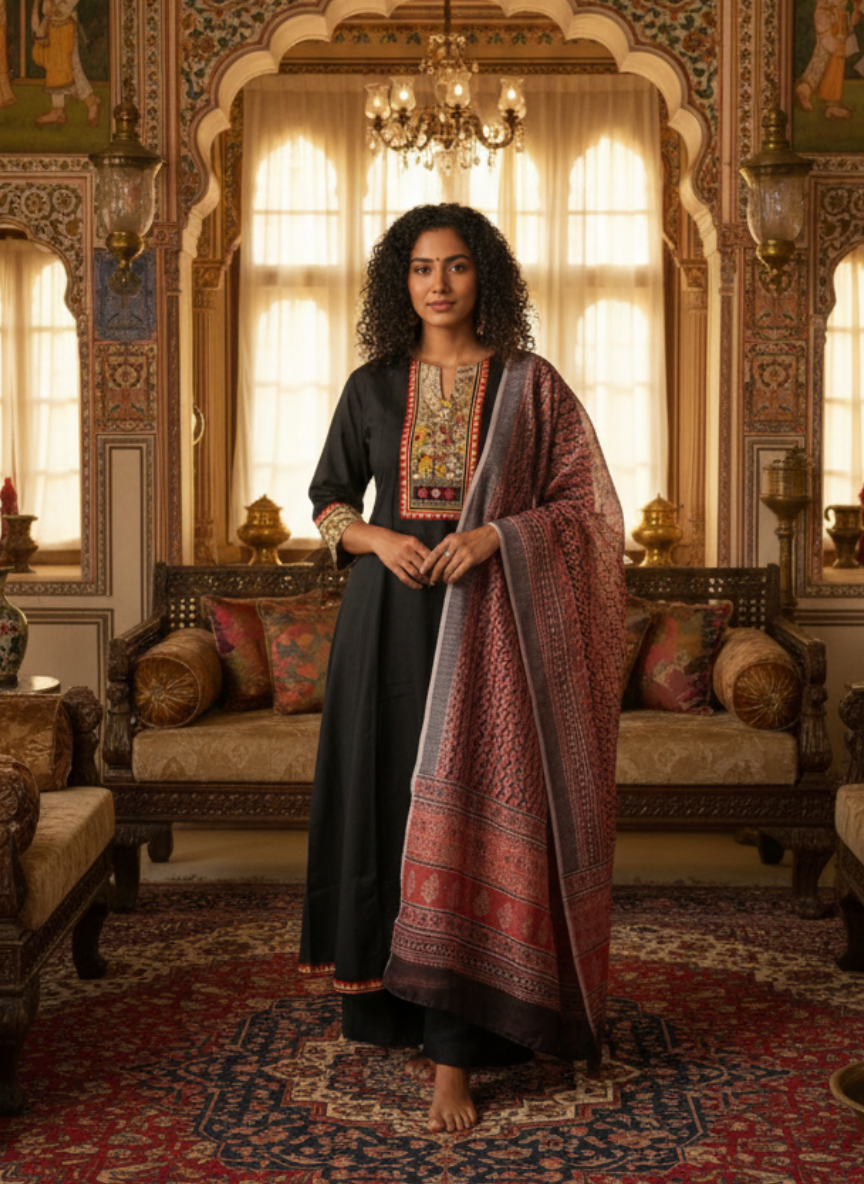 The Classic Black Anarkali Kurta Set is a timeless expression of elegance and understated luxury....