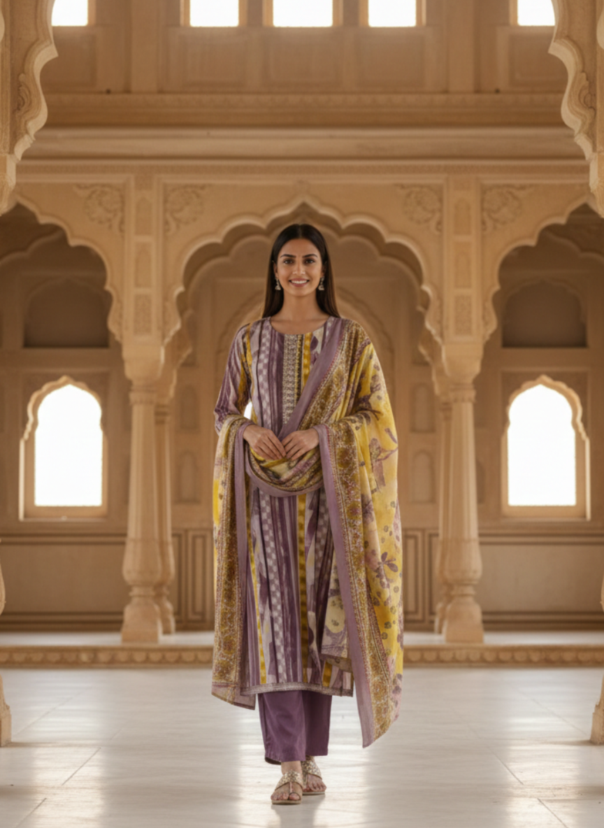 Earthy Mauve & Mustard Striped Kurta Set with Floral Dupatta