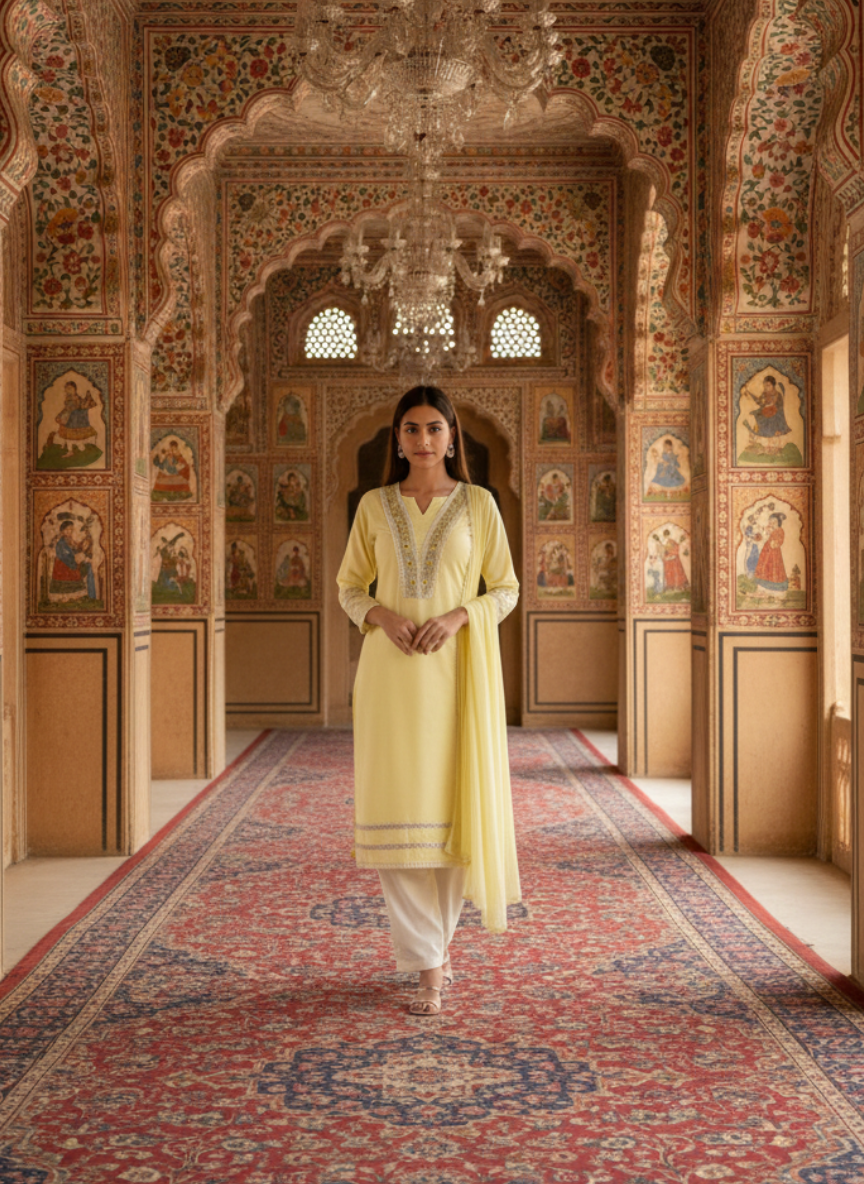 Lemon Yellow Embroidered Kurta Set with Chikankari Detailing