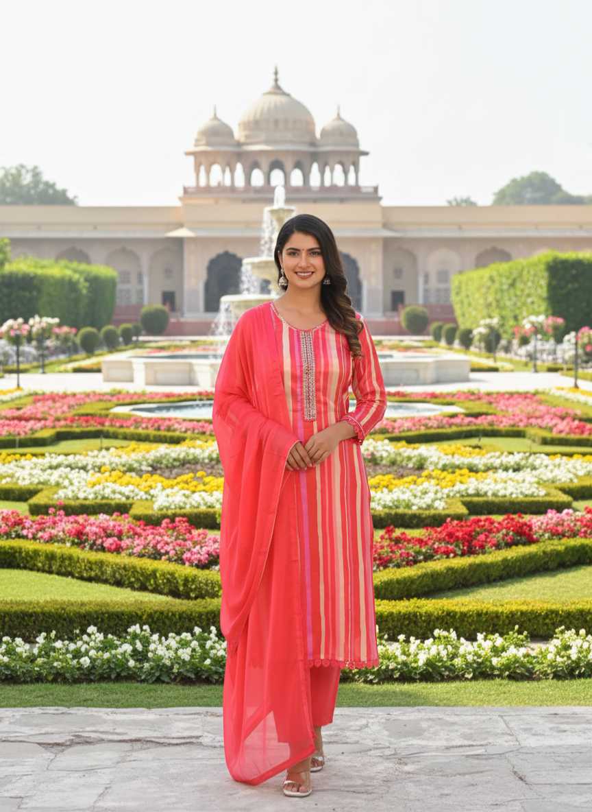 Striking Pink and Coral Striped Kurta Set with Mirror Work