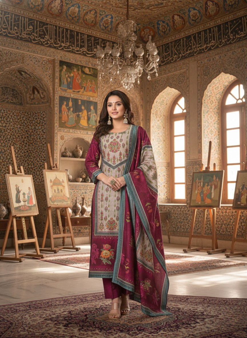 Description:A striking Purple and cream geometric printed kurta set designed for effortless everyday elegance. Featuring...