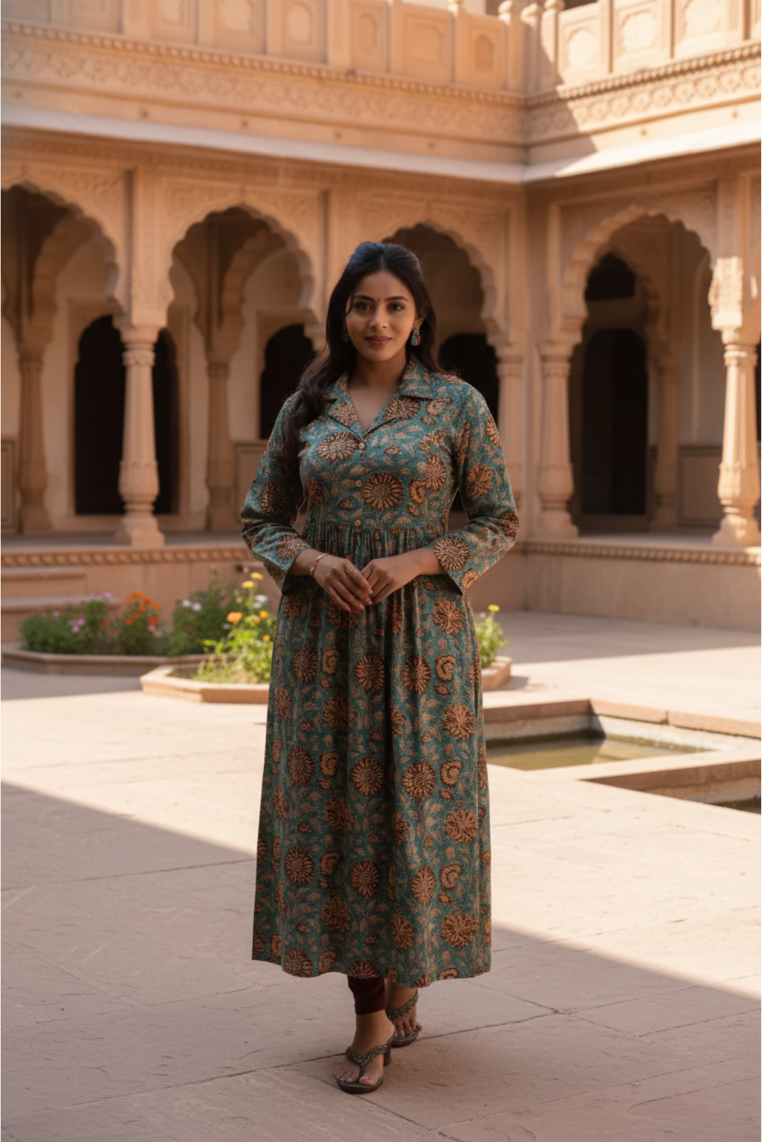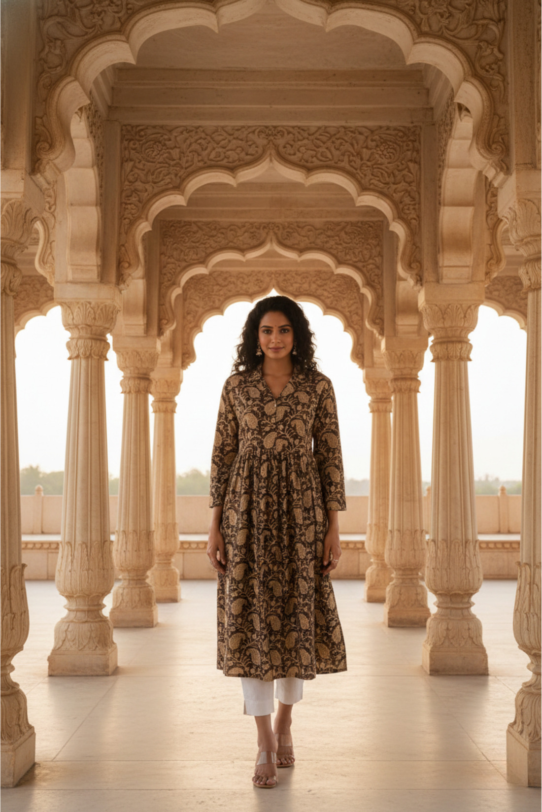 The Emerald Vine Hand-Block Printed Kurta combines the earthy charm of traditional block printing with...
