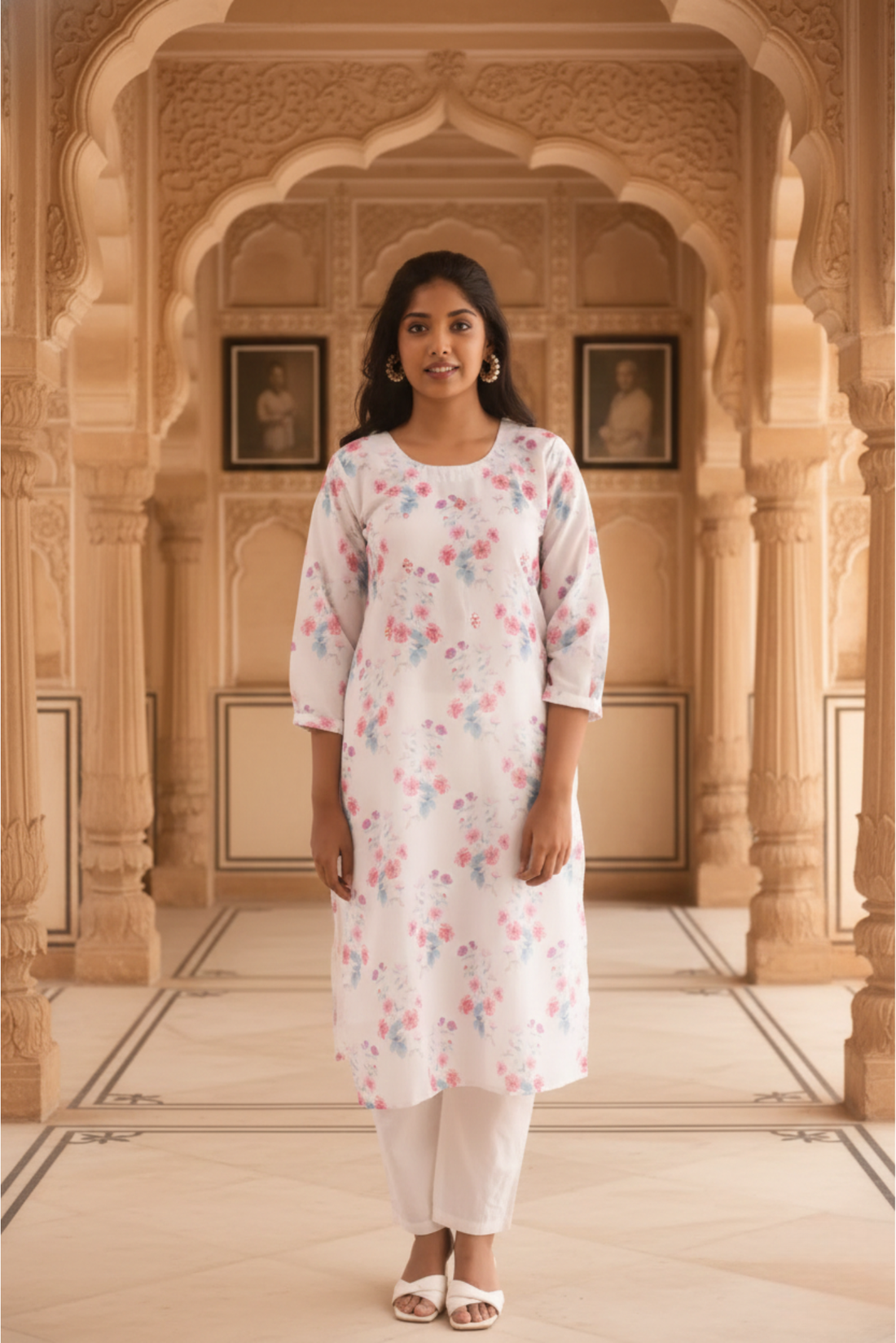 This white linen cotton kurta features an allover pink floral print, adding a fresh touch...