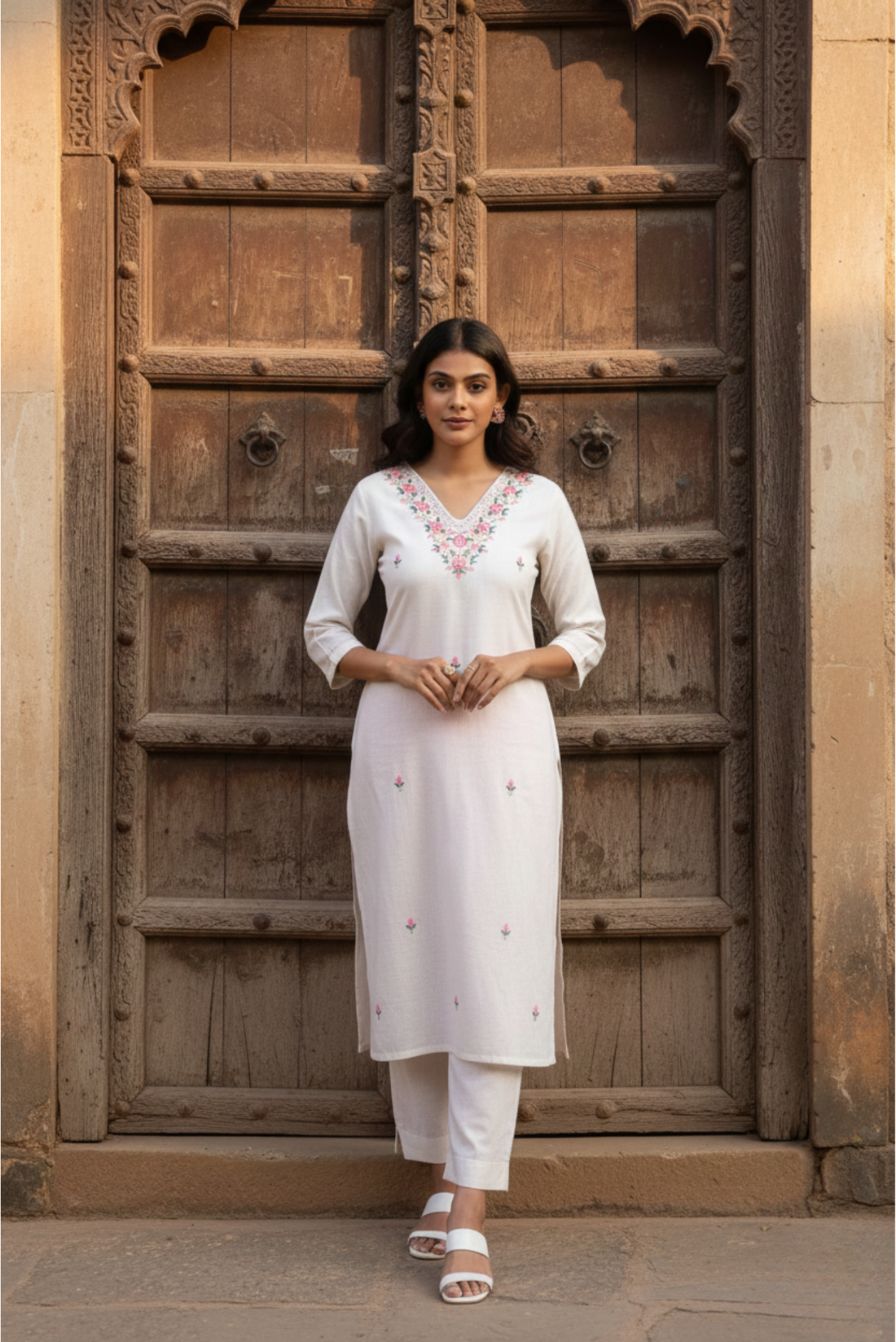 This Elegant white cotton Kurta features delicate floral embroidery in soft pink and green, lightly...