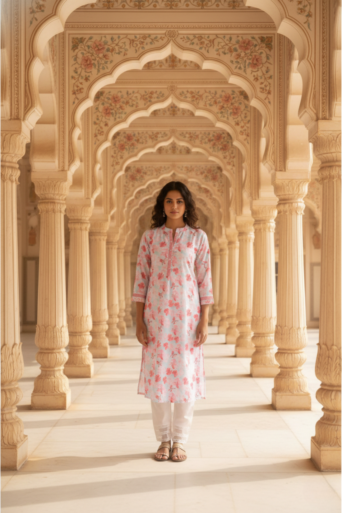 This baby pink kurta features a charming floral print in pink and cement colors, enhanced...
