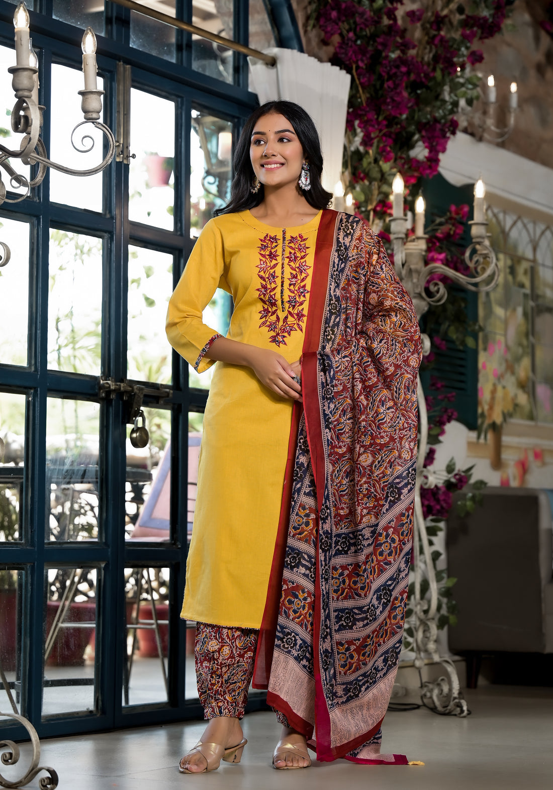Sunlit Mustard Embroidered Kurta Set with Printed Dupatta