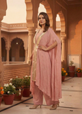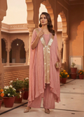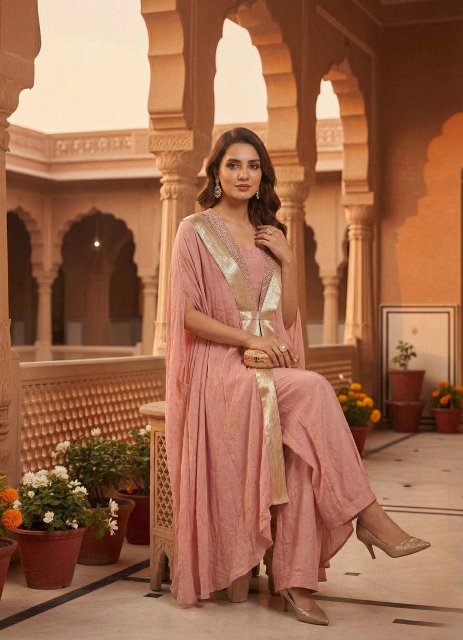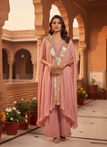 A luxurious blush pink kaftan-style suit set crafted in a soft, flowy fabric that drapes gracefully with every step. The inner blouse features delicate sequin and thread embellishment, perfectly complemented by the kaftan overlay adorned with a rich gold panel that adds regal sophistication. Paired with matching wide-fit pants, this three-piece ensemble blends contemporary elegance with festive charm—ideal for sangeets, cocktail evenings, festive soirées, and grand celebrations.