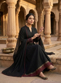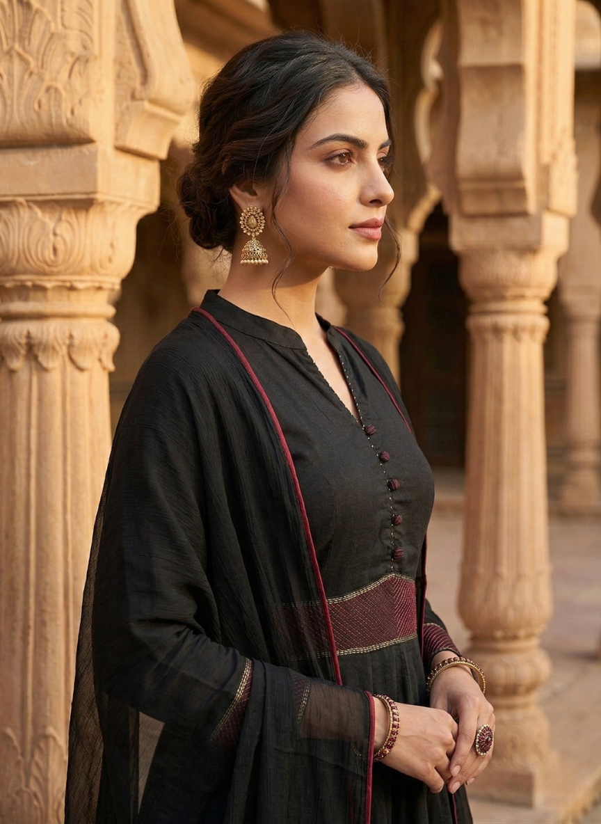The Classic Black Anarkali Kurta Set is a timeless expression of elegance and understated luxury. Designed in a deep black hue, this flared silhouette features subtle panel detailing and a contrast maroon waist accent that adds depth and definition. Paired with a sheer dupatta edged in matching borders, this ensemble exudes grace—perfect for evening occasions and festive celebrations.