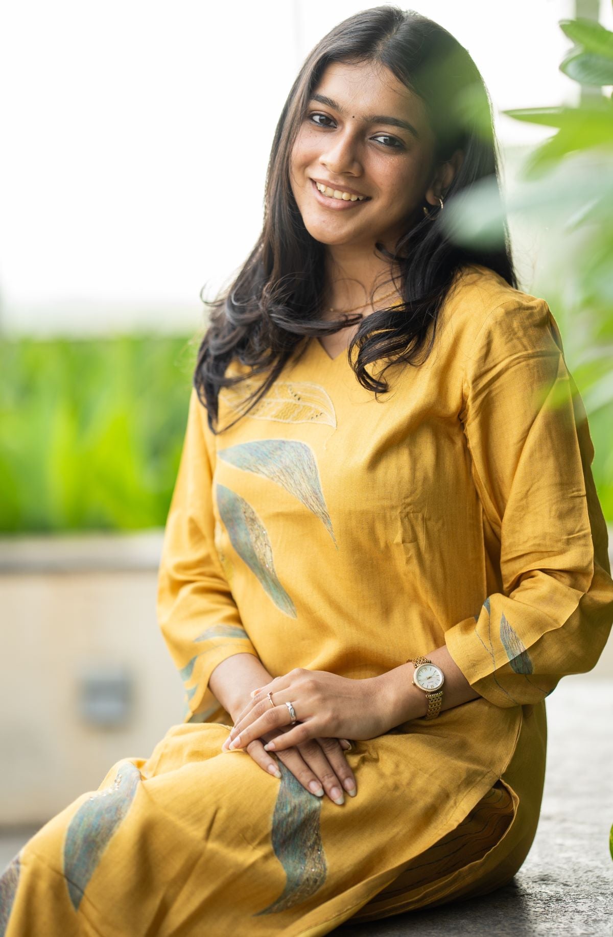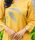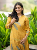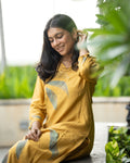 Bring a sunshine glow to your style with this mustard yellow cotton-silk kurta set, designed to blend modern elegance with traditional artistry. The outfit features hand-embellished leaf motifs that add a refined charm, while the soft sheen of the fabric enhances its sophisticated appeal. Lightweight, breathable, and effortlessly graceful — it’s perfect for festive occasions, workwear, or day outings.