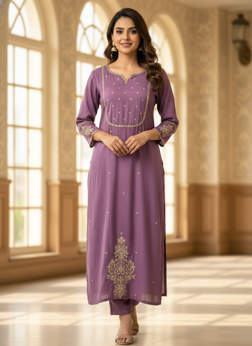 Crafted in a soothing lavender hue, this embroidered kurta and mandala-print dupatta set blends elegance with timeless artistry. The kurta features delicate thread motifs, scalloped neck detailing, and refined sleeve embroidery, while the statement dupatta showcases intricate mandala-inspired patterns that elevate the entire look. Perfect for festive gatherings, cultural celebrations, or graceful daytime events.