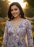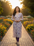 A soothing lavender printed kurta designed with an elegant V-neckline and subtle thread embroidery that adds a refined festive touch. The blend of lilac, beige, and white tones creates a soft, graceful aesthetic perfect for everyday wear, brunch outings, or casual gatherings. Its comfortable silhouette makes it an easy go-to for effortless ethnic styling.