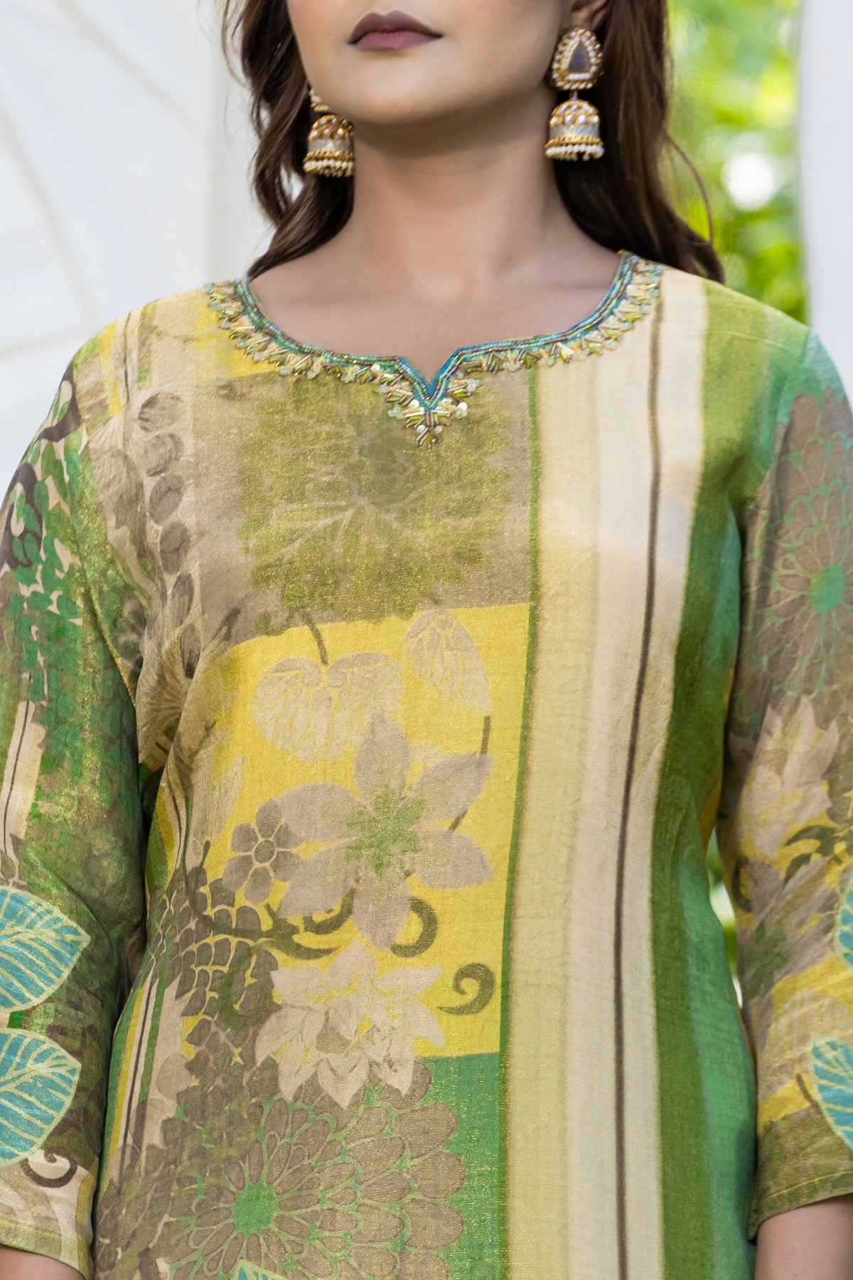 A radiant blend of freshness and elegance, this Leafy Lime Green Digital Printed Suit Set is crafted in lightweight fabric featuring botanical prints in vibrant shades of green, blue, and yellow. The kurta showcases intricate beaded detailing along the neckline, making it perfect for both daytime gatherings and festive occasions.
