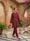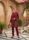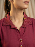 A rich maroon co-ord set crafted in a soft, textured fabric and adorned with elegant multicolour thread embroidery along the hem, cuffs, and collar. The shirt-style kurta features a refined collared neckline with delicate embroidered detailing and subtle shimmer buttons, giving it a modern yet ethnic appeal. Paired with straight-fit matching trousers, this set blends comfort, sophistication, and festive charm—perfect for intimate celebrations, casual festive gatherings, and elegant day wear.