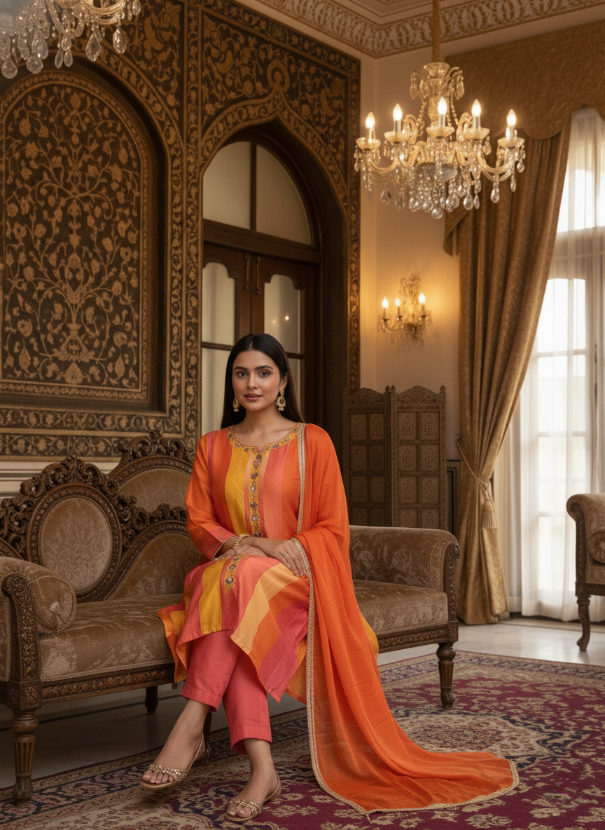 Bright, festive, and full of charm, this multitone orange striped kurta set brings together warm sunset hues in a fluid, elegant silhouette. The vertical panel design elongates the frame, while delicate embroidery along the neckline adds a sophisticated artisanal touch. Paired with a soft drape dupatta and tonal pants, this set feels perfect for festive mornings, haldi functions, or joyful celebrations.
