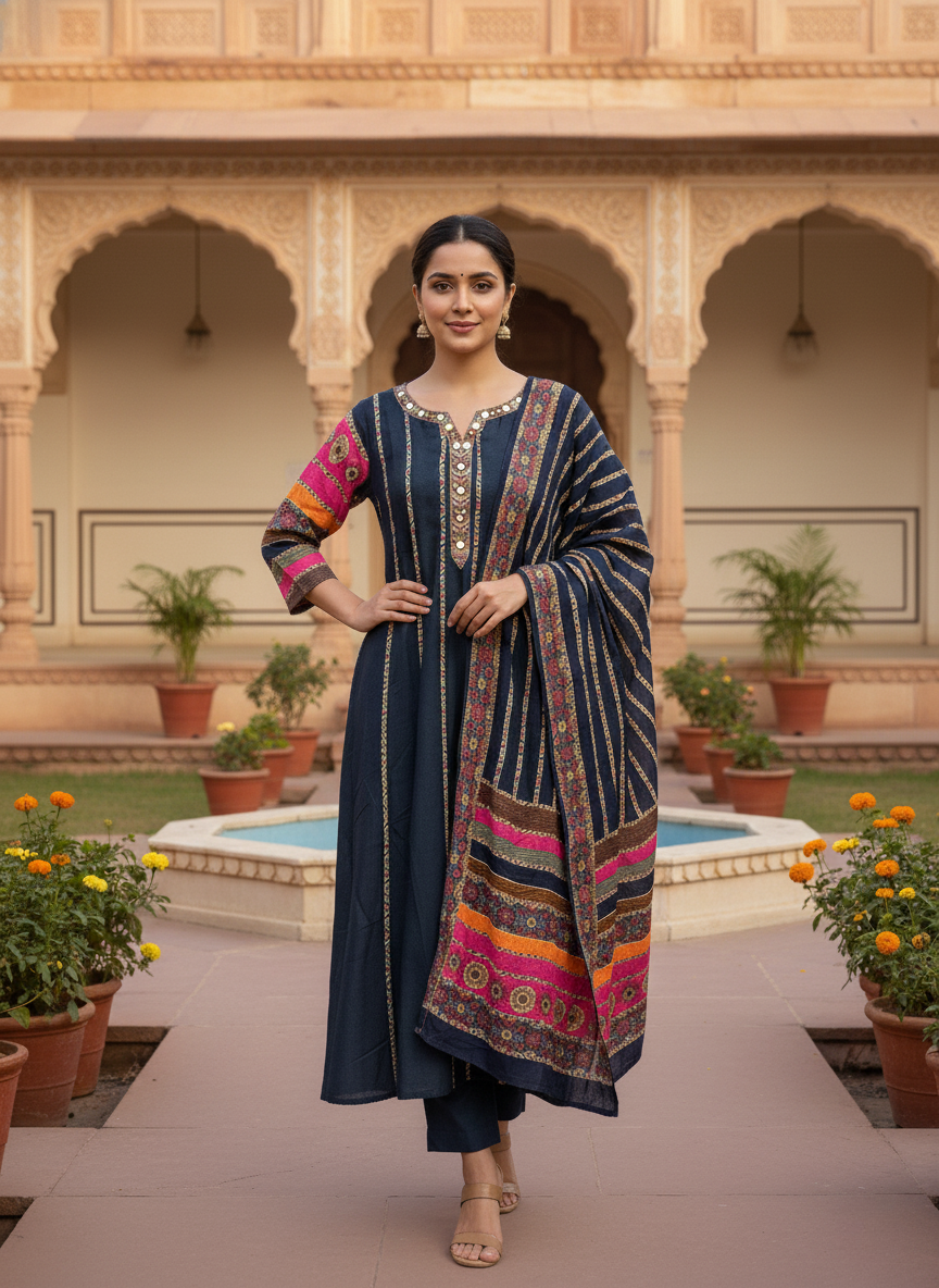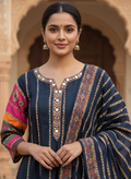 A rich fusion of tradition and bold artistry, this navy multicolor printed anarkali kurta set features intricate ethnic motifs and mirror detailing that instantly uplift your festive style. The vibrant sleeve pattern, paired with a beautifully coordinated dupatta, adds a pop of color while maintaining an elegant silhouette. Perfect for festive gatherings, cultural events, or daytime celebrations.