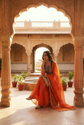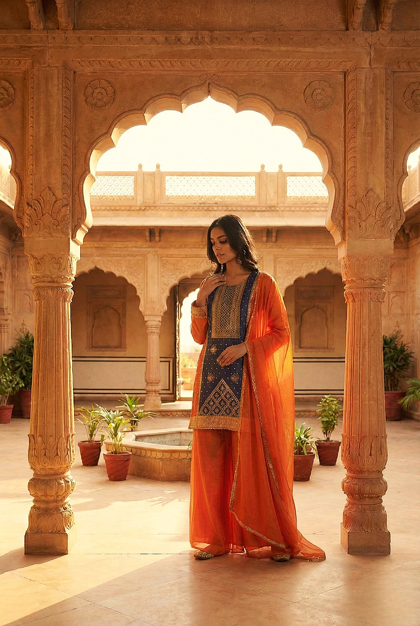A vibrant orange sharara set paired with a beautifully detailed navy kurti, crafted in soft flowy fabric that radiates festive charm. The kurti features intricate golden embroidery along the neckline, hem, and panel, creating a rich contrast against the deep navy base. Complemented by a sheer orange dupatta with delicate gold edging, this ensemble delivers a regal yet effortless festive look. Perfect for weddings, mehendi functions, festive celebrations, and grand occasions.