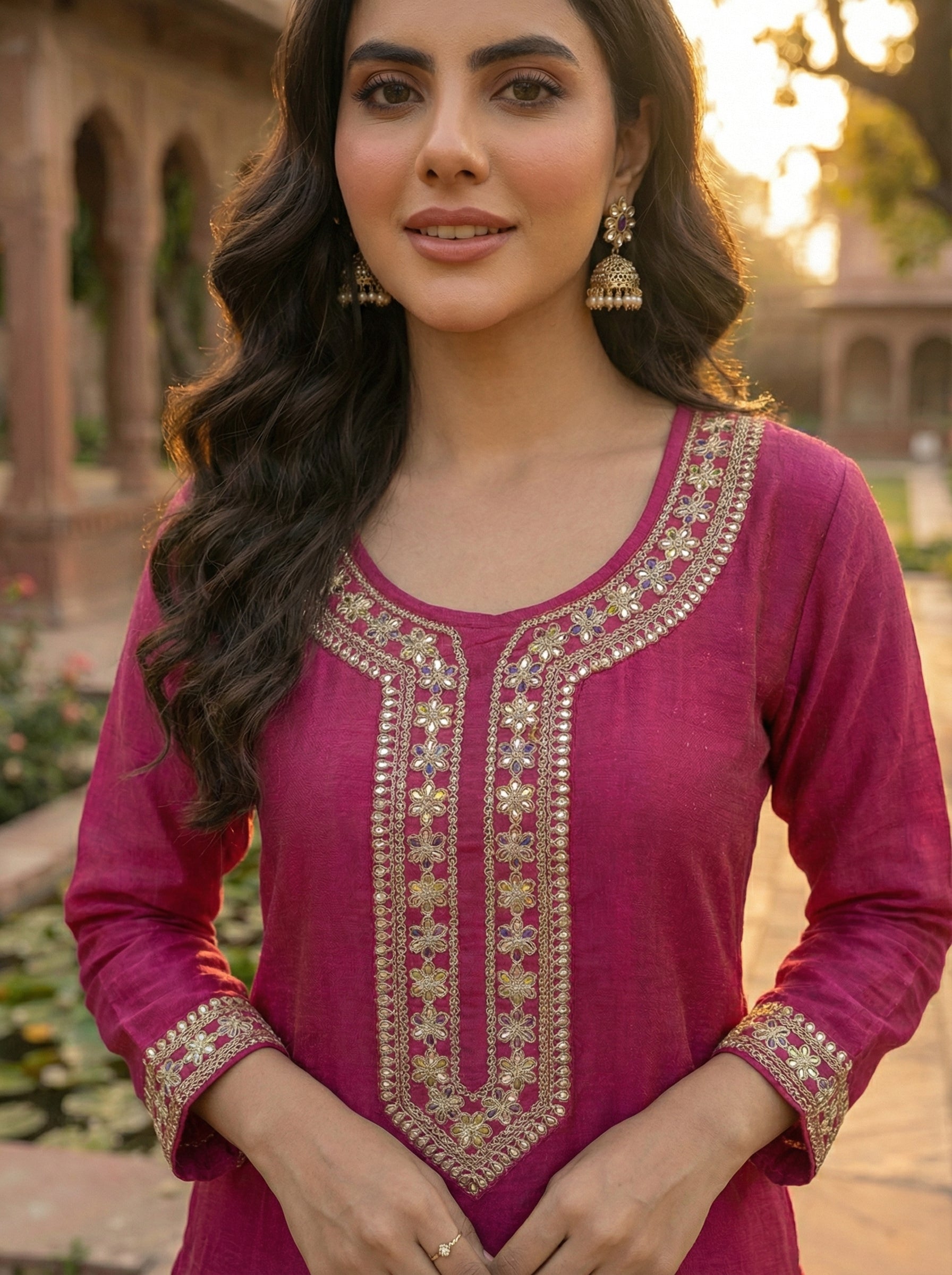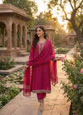 A vibrant rani pink kurta set crafted in a rich, flowy fabric adorned with exquisite thread embroidery along the neckline and sleeve cuffs. The intricate floral motifs and shimmering detailing bring a festive elegance, while the straight silhouette ensures effortless comfort. Paired with a matching dupatta featuring subtly sprinkled embellishments and embroidered borders, this set is perfect for festive gatherings, family functions, and timeless ethnic charm.