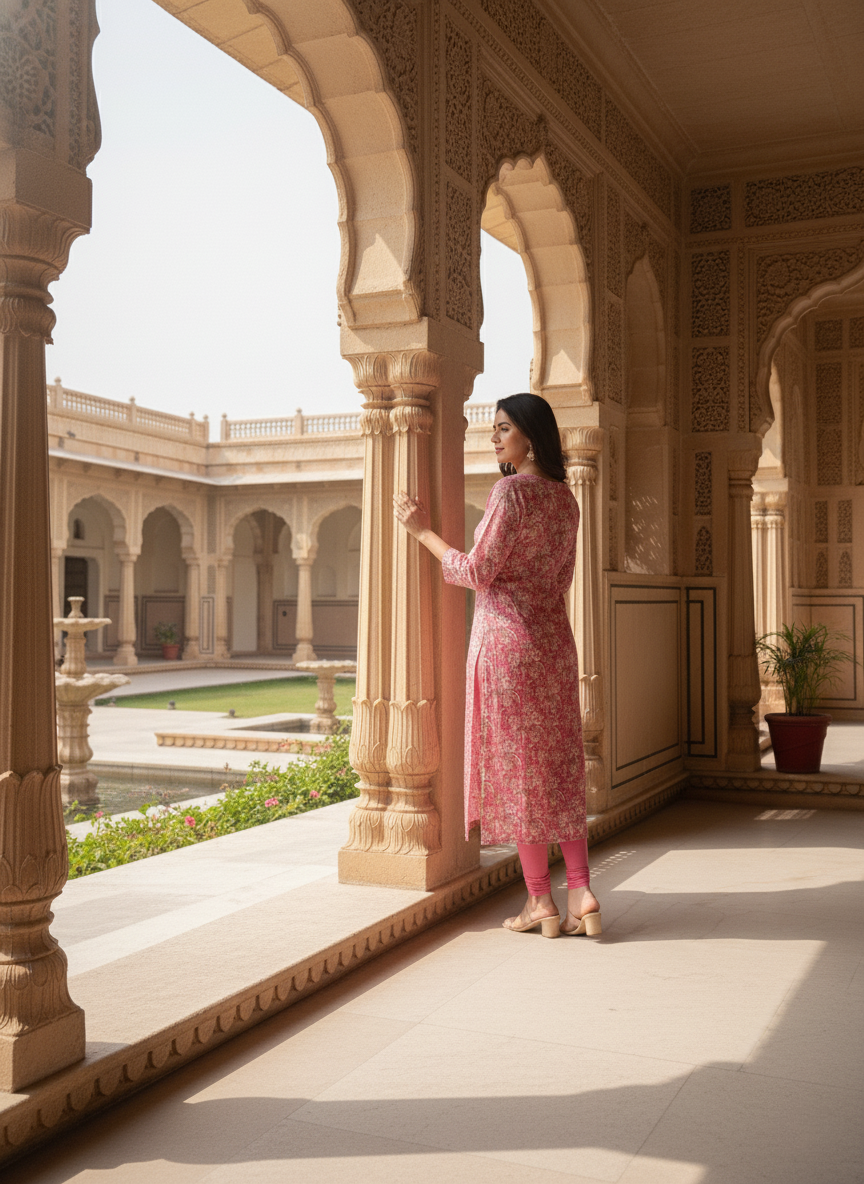 Style this vibrant kurta with pink or beige leggings, minimal gold jewelry, and comfortable flats. Keep your hair soft and natural for an effortlessly fresh daytime look.