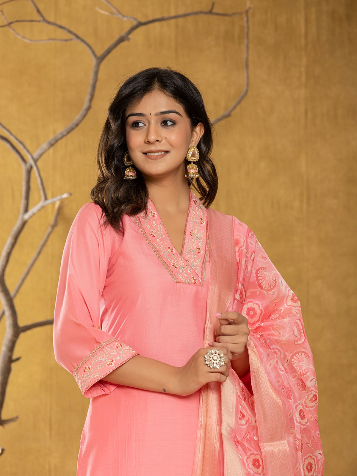 Radiate charm with this soft pink embroidered kurta set, crafted from a silky fabric that combines comfort with timeless sophistication. The delicate thread and sequin embroidery along the neckline and sleeves lend it refined elegance, while the beautifully woven dupatta adds a festive flair. Perfect for daytime celebrations, festive gatherings, or elegant evening events.