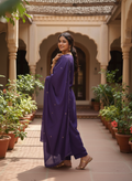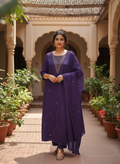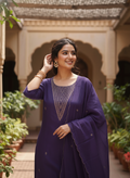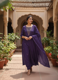 A graceful deep purple kurta set crafted in a soft, flowy malai silk fabric featuring delicate thread embroidery along the neckline and scattered butis across the silhouette. The straight-cut kurta paired with matching pants and a subtly embellished dupatta creates an effortlessly elegant look ideal for festive gatherings, family functions, and elevated everyday ethnic style. Its breathable drape and timeless detailing make it a wardrobe must-have.