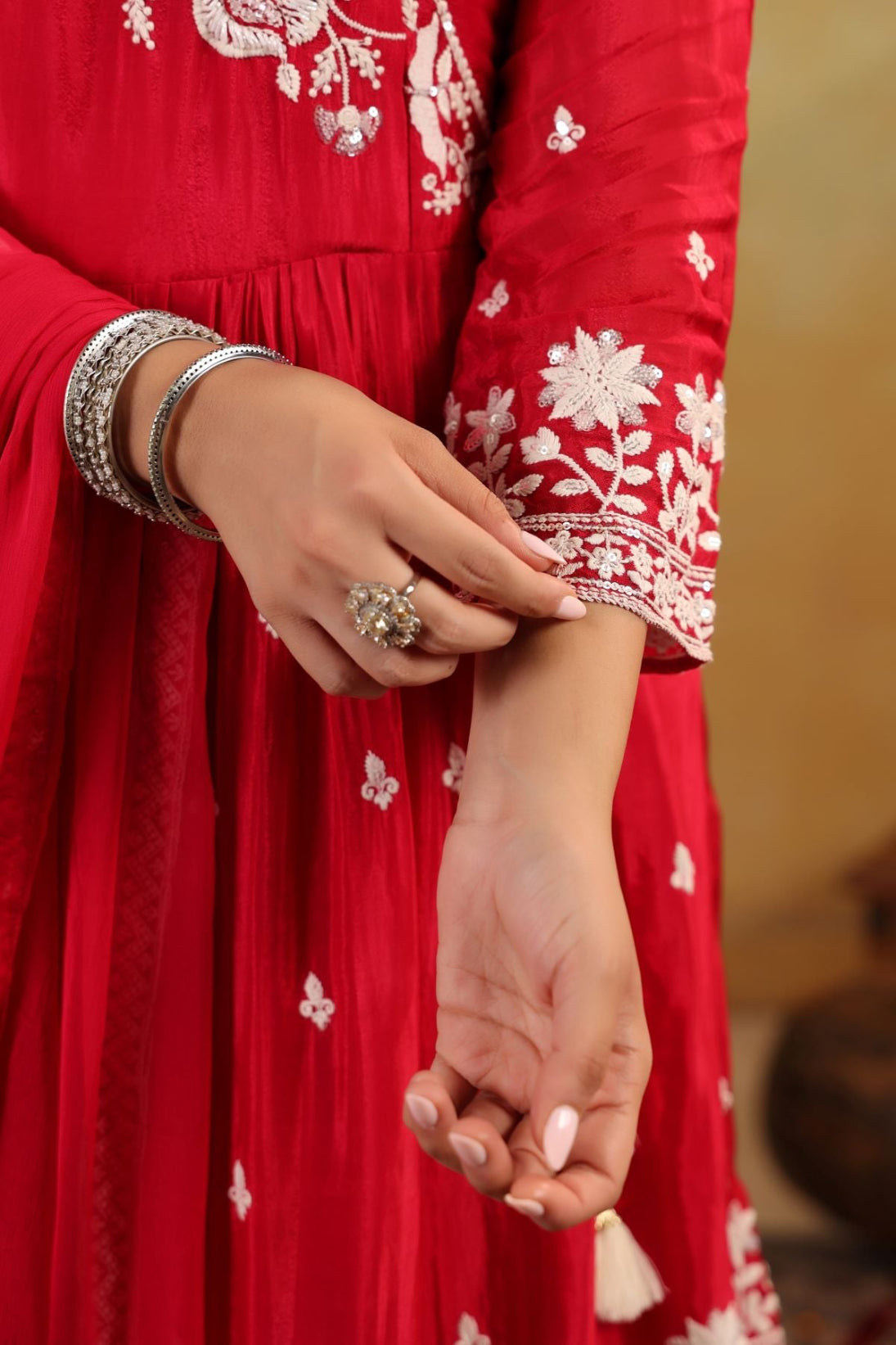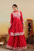 Elevate your festive wardrobe with this Red Georgette Embroidered Skirt & Top set, complemented by a matching dupatta. Crafted from lightweight, breathable georgette fabric, it ensures comfort while showcasing intricate embroidery that adds refined elegance. The coordinated pieces offer versatility for styling, making it ideal for special occasions and cultural celebrations. This ensemble delivers a balanced blend of traditional craftsmanship and contemporary design.