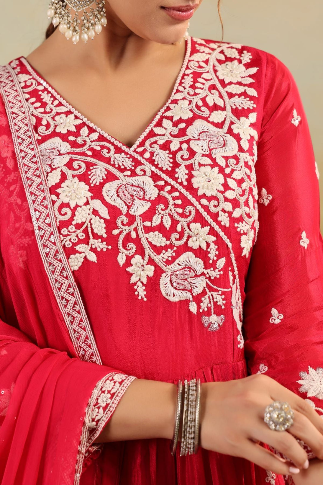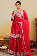 Red Georgette Embroidered Skirt & Top with Dupatta