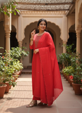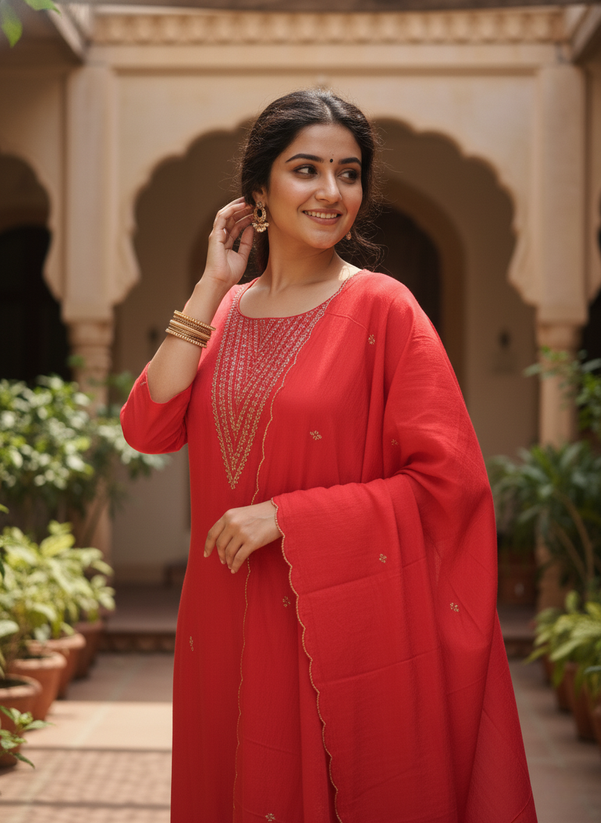 A vibrant red kurta crafted for effortless elegance, featuring intricate tonal embroidery that enhances its festive appeal. The soft, malai silk flowy fabric drapes beautifully, offering comfort while maintaining a refined silhouette. Perfect for festive gatherings, family events, or daytime celebrations.