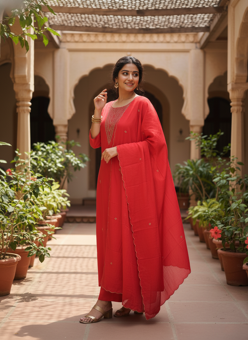 Pair this bright red kurta with gold jhumkas or pearl studs, a sleek bun or soft curls, and nude or gold sandals. Add a matching potli or clutch for a polished festive look.
