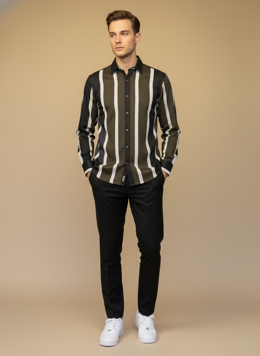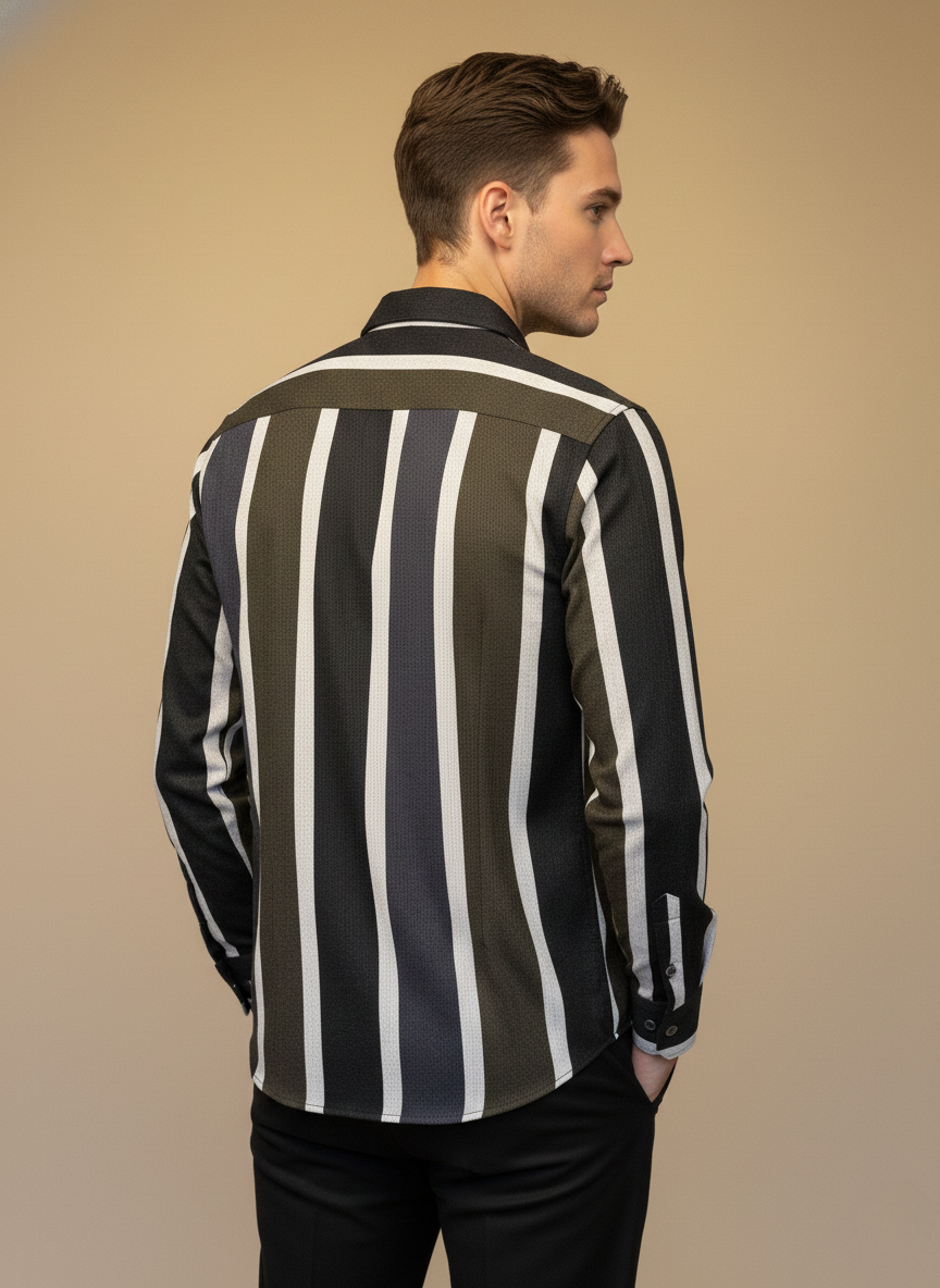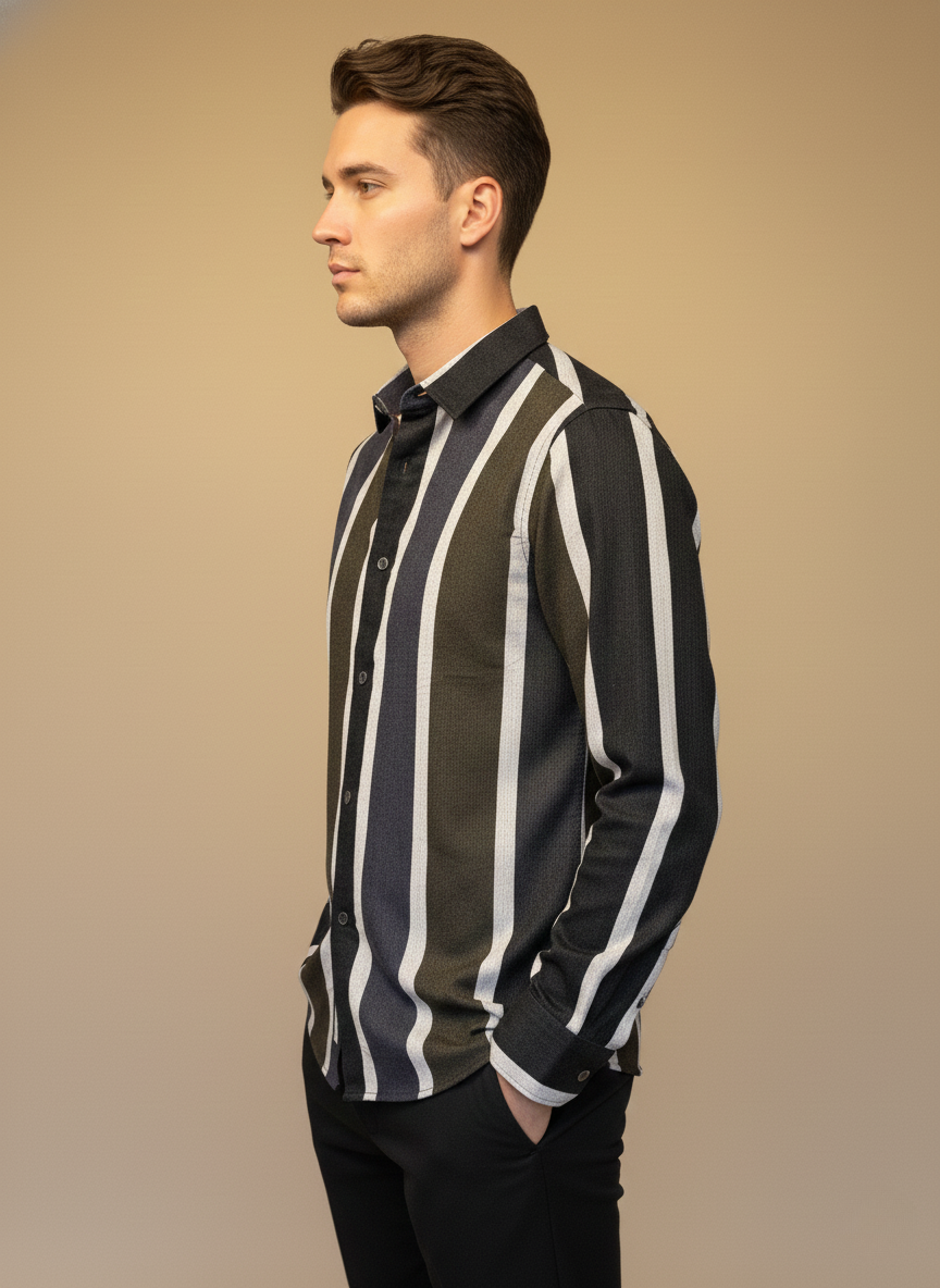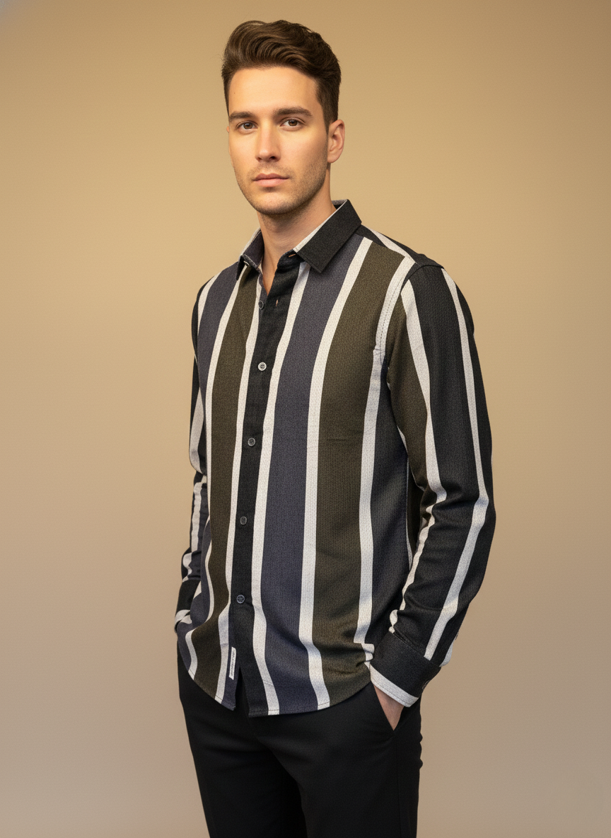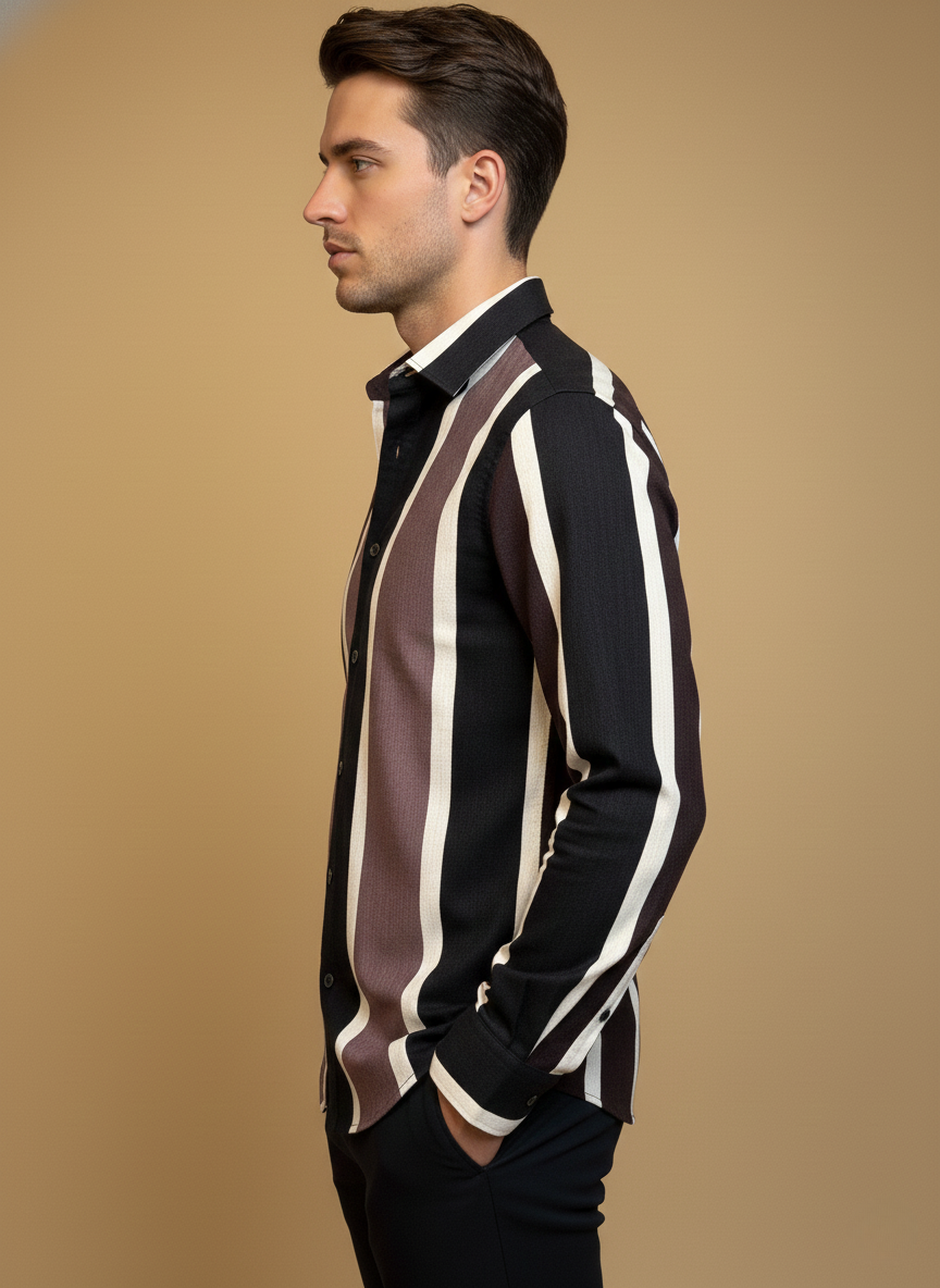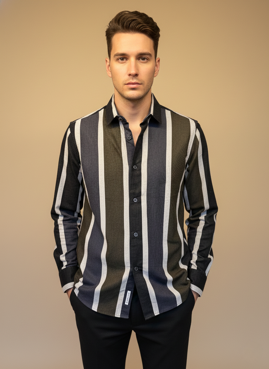 A refined, modern vertical-stripe shirt crafted in rich dual-tone hues, designed to elongate the frame and elevate everyday dressing. With a premium textured finish and sleek silhouette, this shirt blends contemporary style with effortless sophistication—perfect for casual outings, evenings, and smart-casual events.