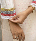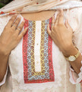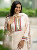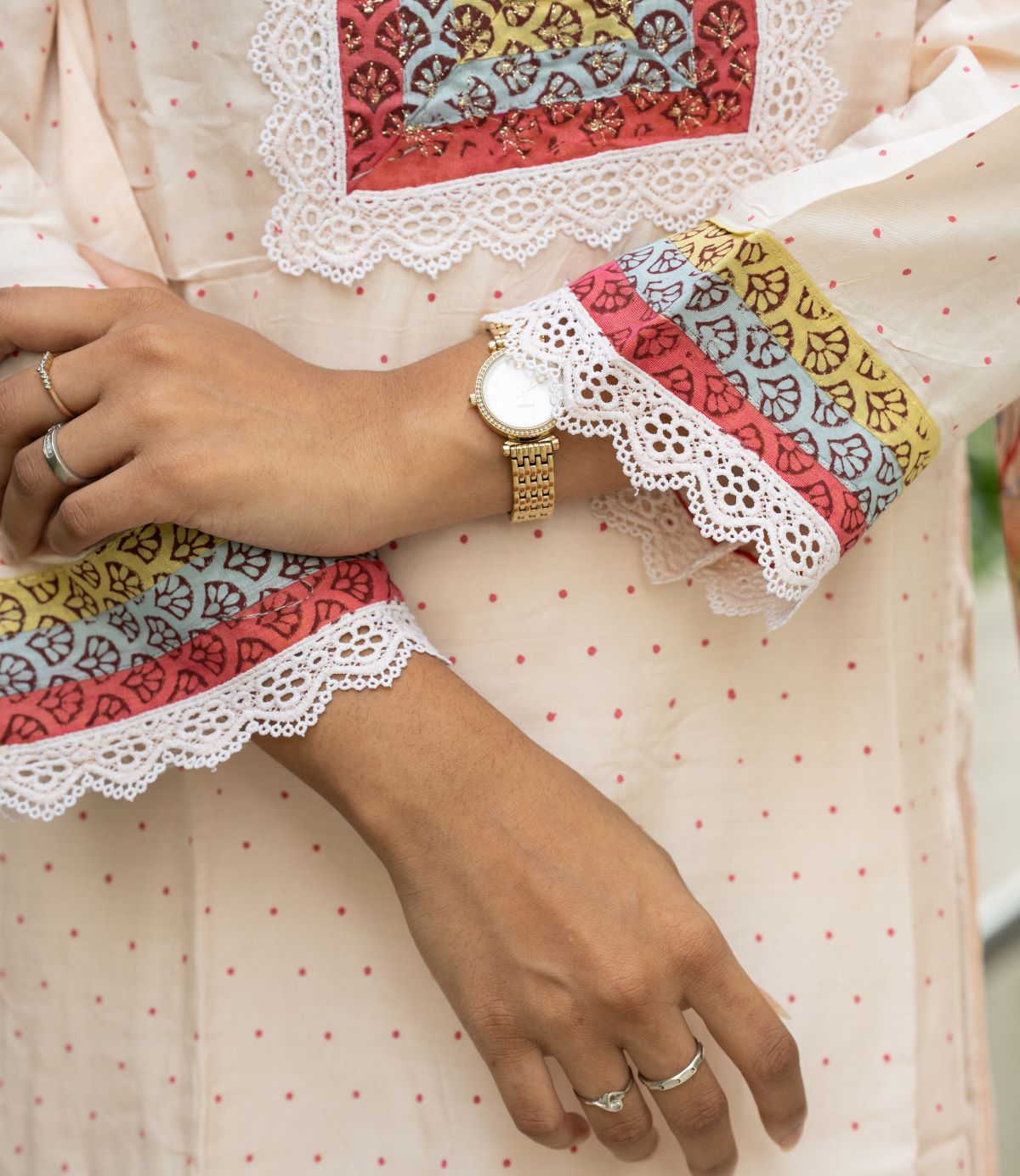 Radiate understated charm with this serene cream kurta set, designed to reflect effortless sophistication and everyday ease. The kurta features a vibrant block-printed panel along the neckline in shades of red, mustard, and blue, bordered with delicate white lace for a handcrafted touch. Tiny dotted prints across the fabric add subtle texture, while the cuffs mirror the colorful pattern for a coordinated finish. The look is completed with a soft printed dupatta featuring floral and geometric motifs and straight-fit pants that ensure comfort with elegance.