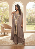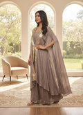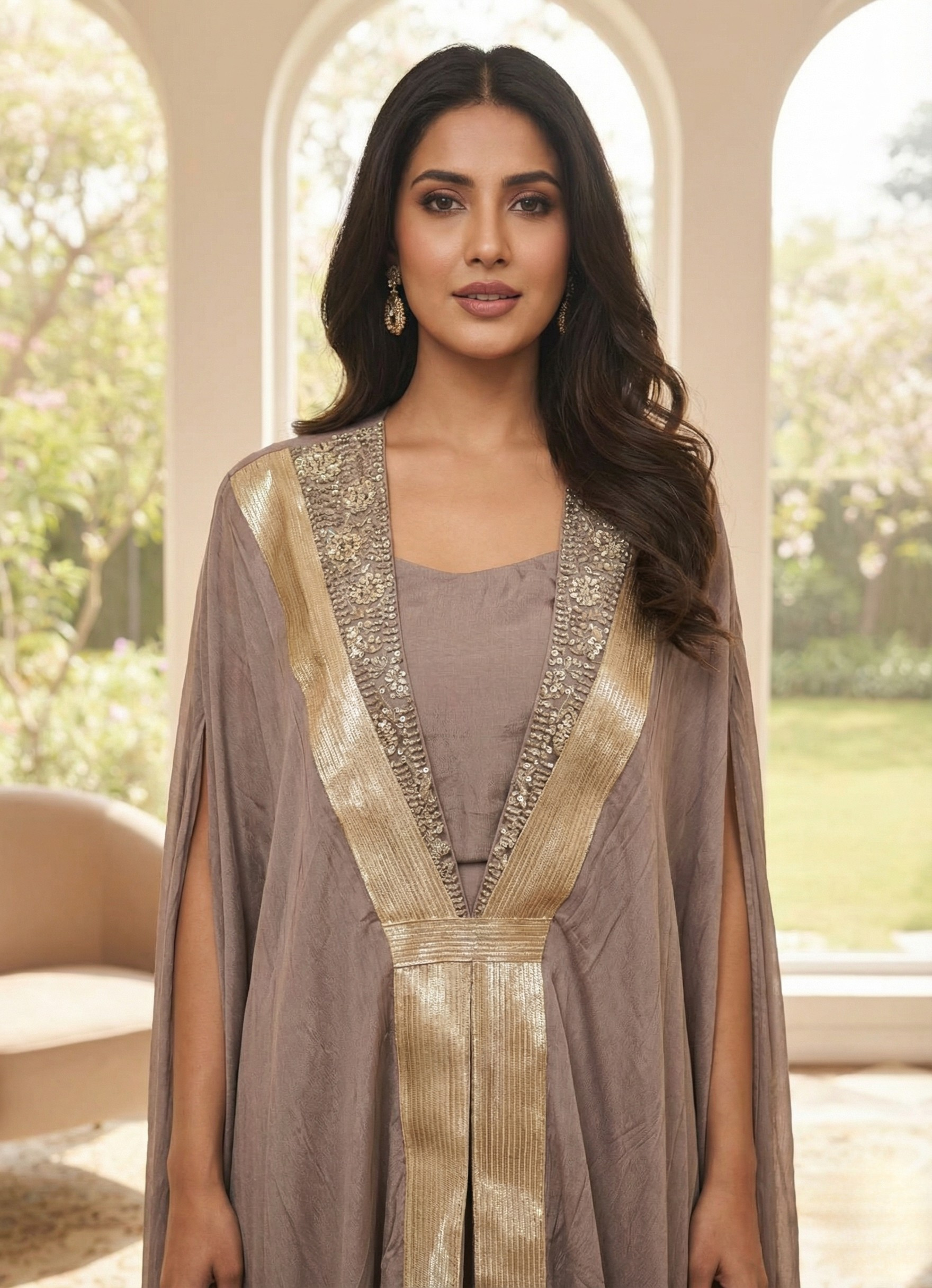 A luxurious taupe kaftan dress designed with a fluid drape that blends modern elegance with timeless sophistication. The front panel features rich gold detailing paired with intricate sequin embellishment along the neckline, adding subtle glamour without overpowering the look. Crafted in a lightweight, flowy fabric, this ensemble cascades beautifully, creating an effortlessly regal silhouette—perfect for festive evenings, cocktail gatherings, and contemporary celebrations.