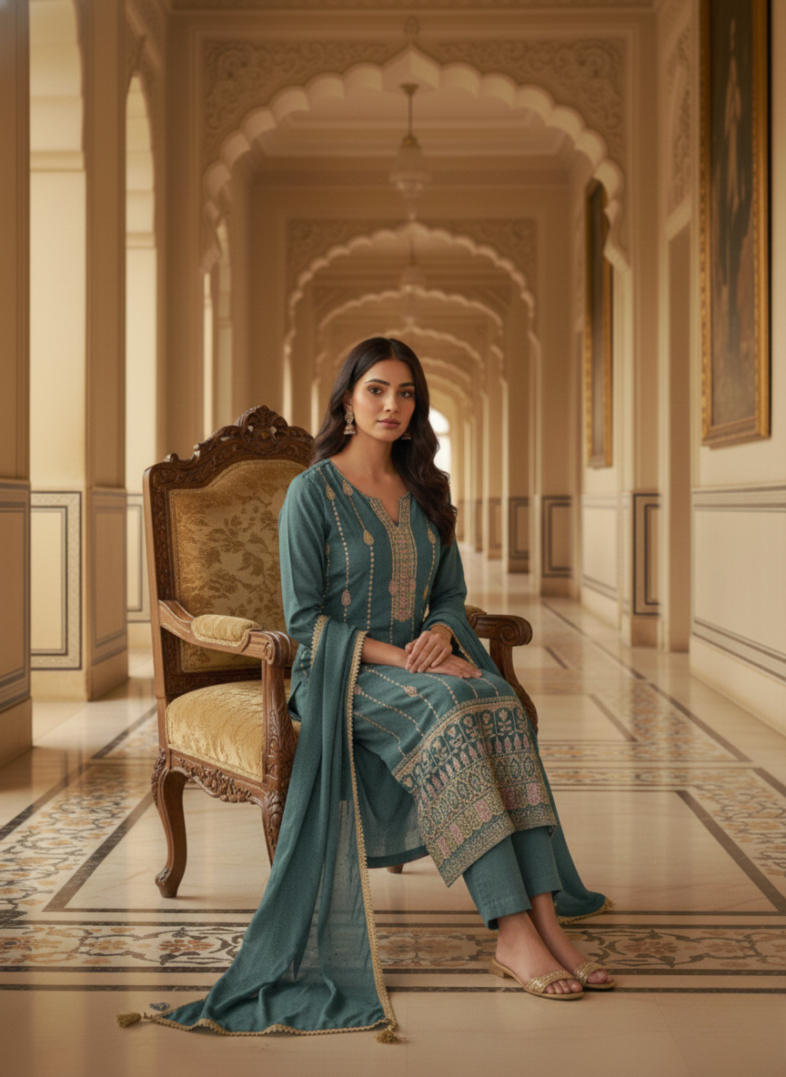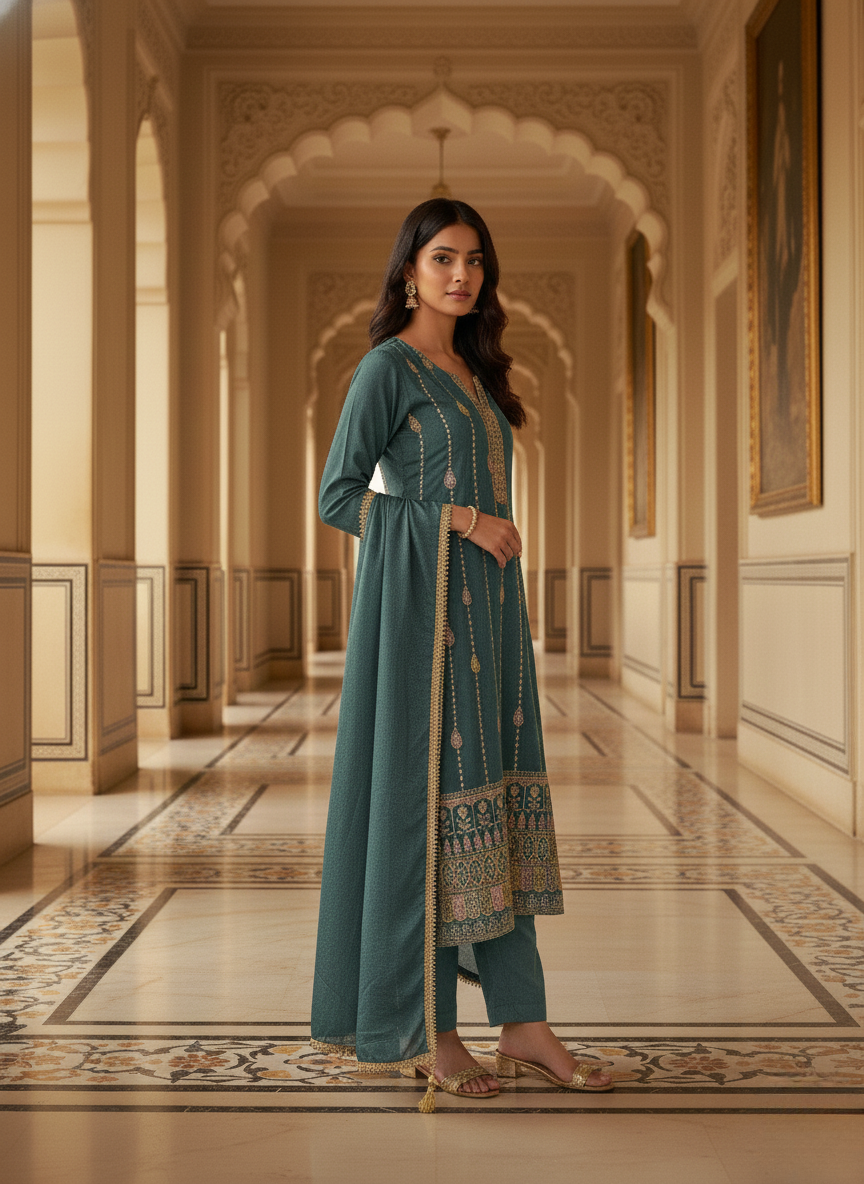 An elegant teal kurta set crafted in a soft, flowy textured fabric featuring intricate ethnic embroidery along the neckline, panels, and hemline. The straight-cut kurta paired with matching pants and a coordinated embroidered dupatta creates a refined and regal silhouette. Designed for festive gatherings, family functions, and sophisticated daytime elegance, this set combines comfort with timeless ornamental detailing.