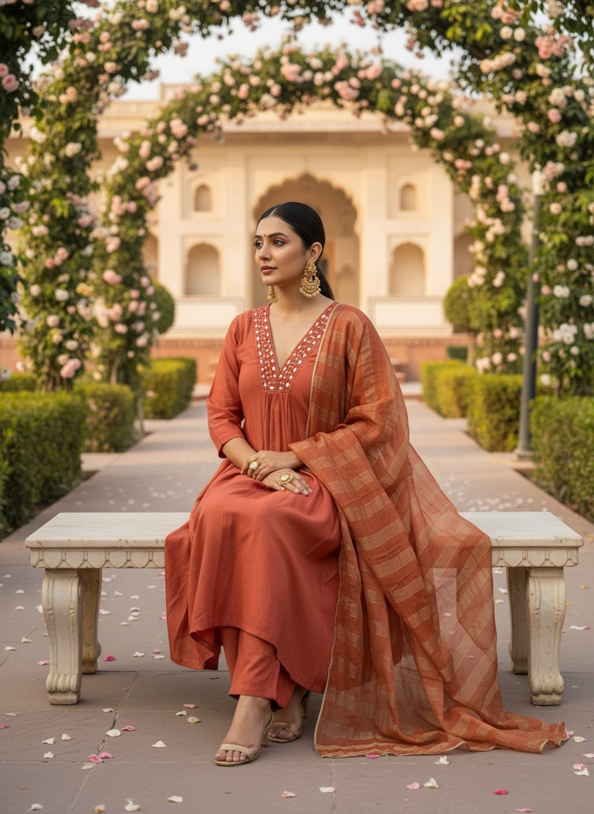 A serene blend of tradition and modern grace, this terracotta mirror-work kurta set radiates effortless festive charm. The rich warm tone, paired with hand-finished mirror embellishments along the neckline, creates a soft glow perfect for daytime functions, mehendi ceremonies, and elegant gatherings. The striped dupatta adds a refined artisanal touch, completing an outfit that feels both timeless and refreshing.