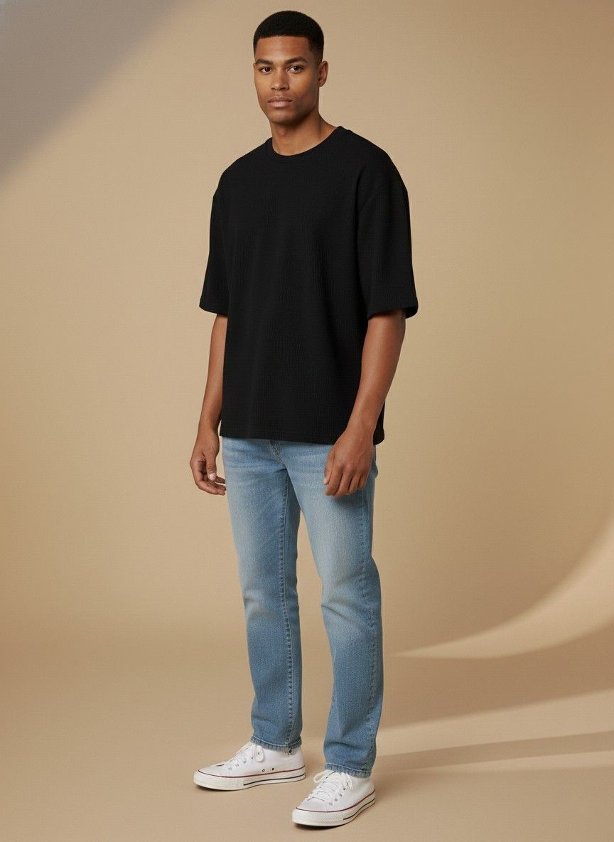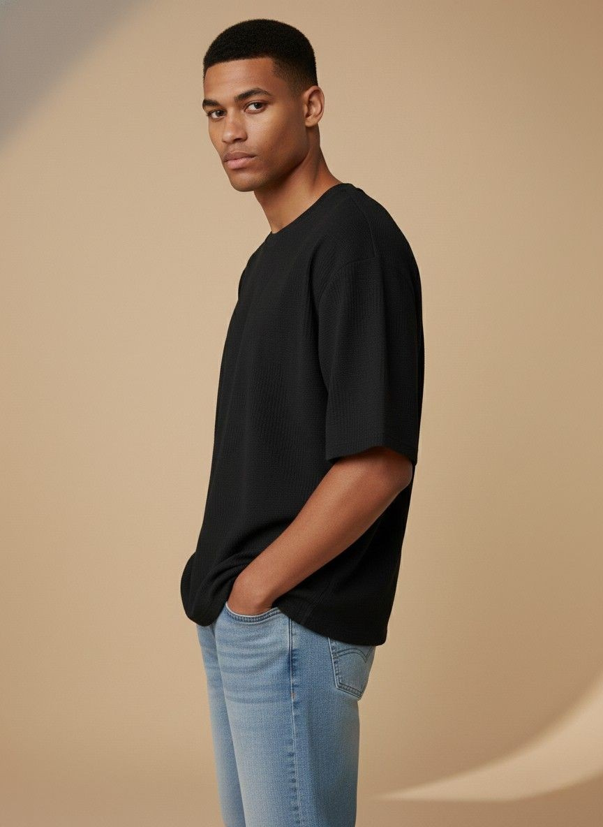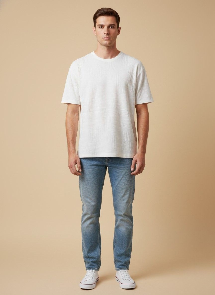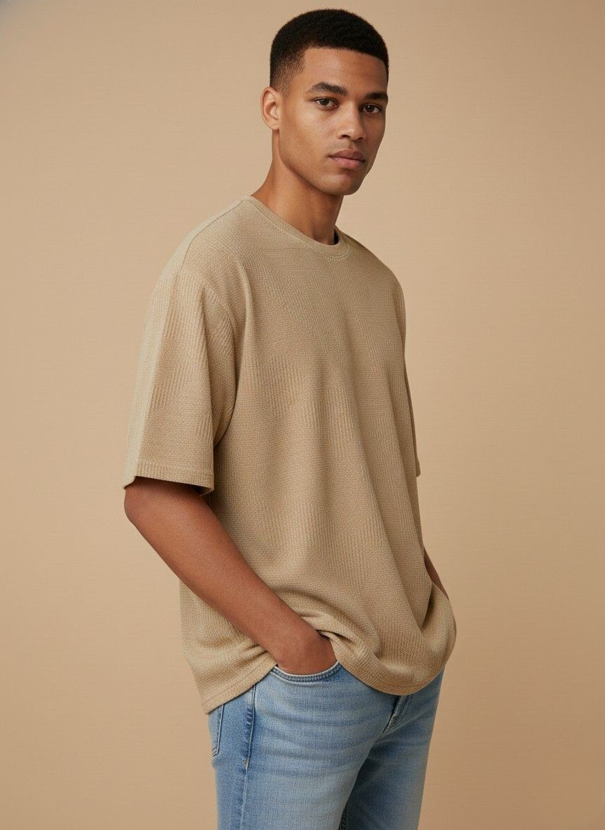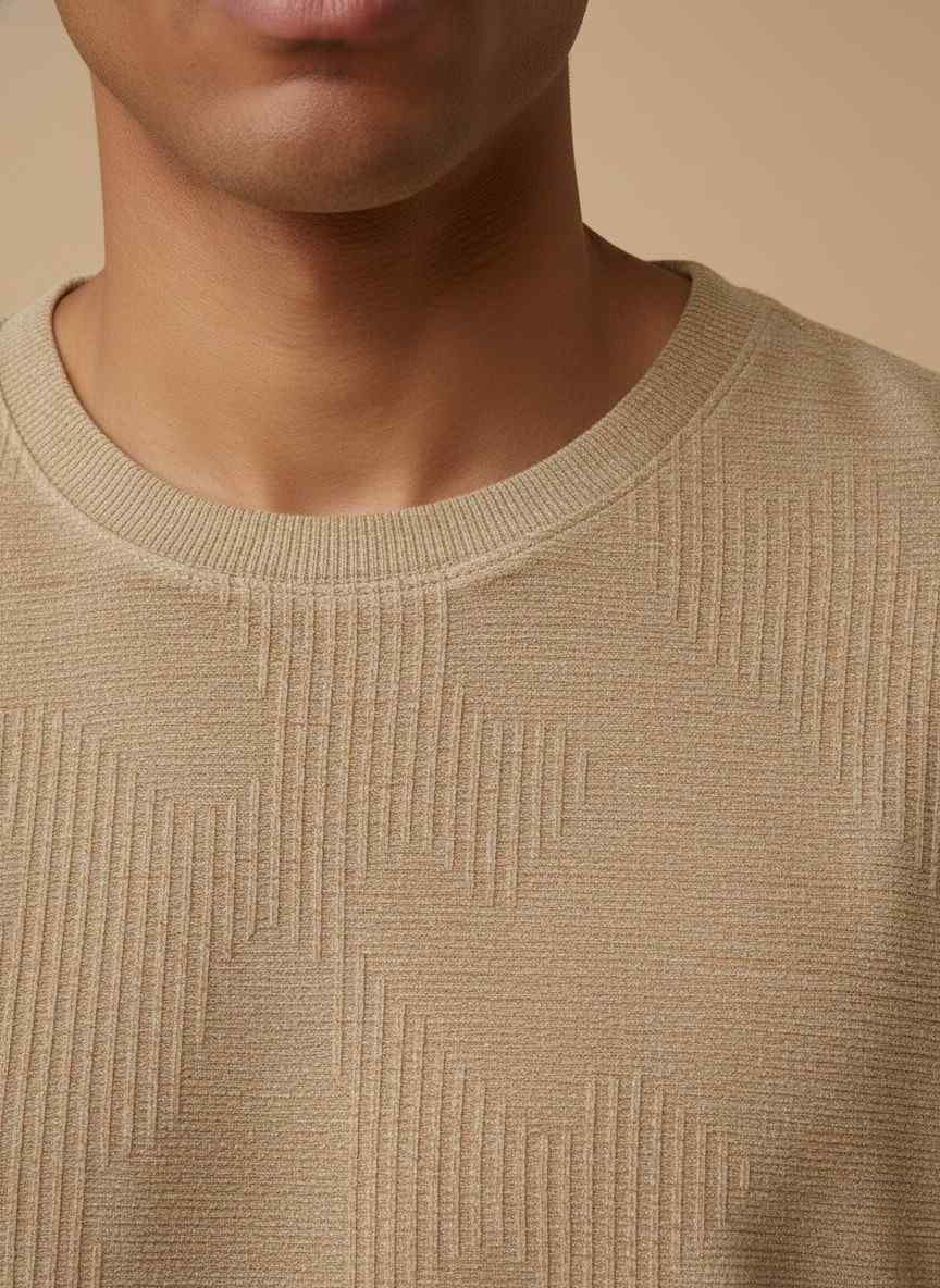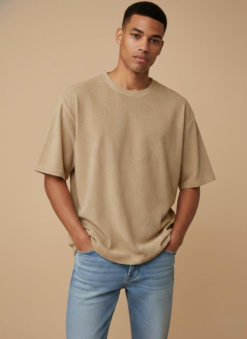 Elevate your everyday style with this premium textured T-shirt, crafted from a soft, breathable knit fabric. The subtle geometric pattern adds depth and sophistication, giving it a refined look perfect for casual outings or elevated minimal wear. Designed for comfort with a relaxed silhouette, it pairs effortlessly with jeans, chinos, or shorts.