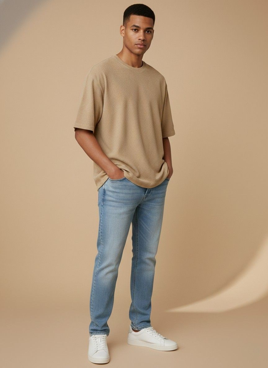 Style it with light-wash denim and sneakers for an easy casual fit, or pair with tailored trousers and loafers for a minimal yet refined look. Add a lightweight jacket to complete a smart weekend outfit.